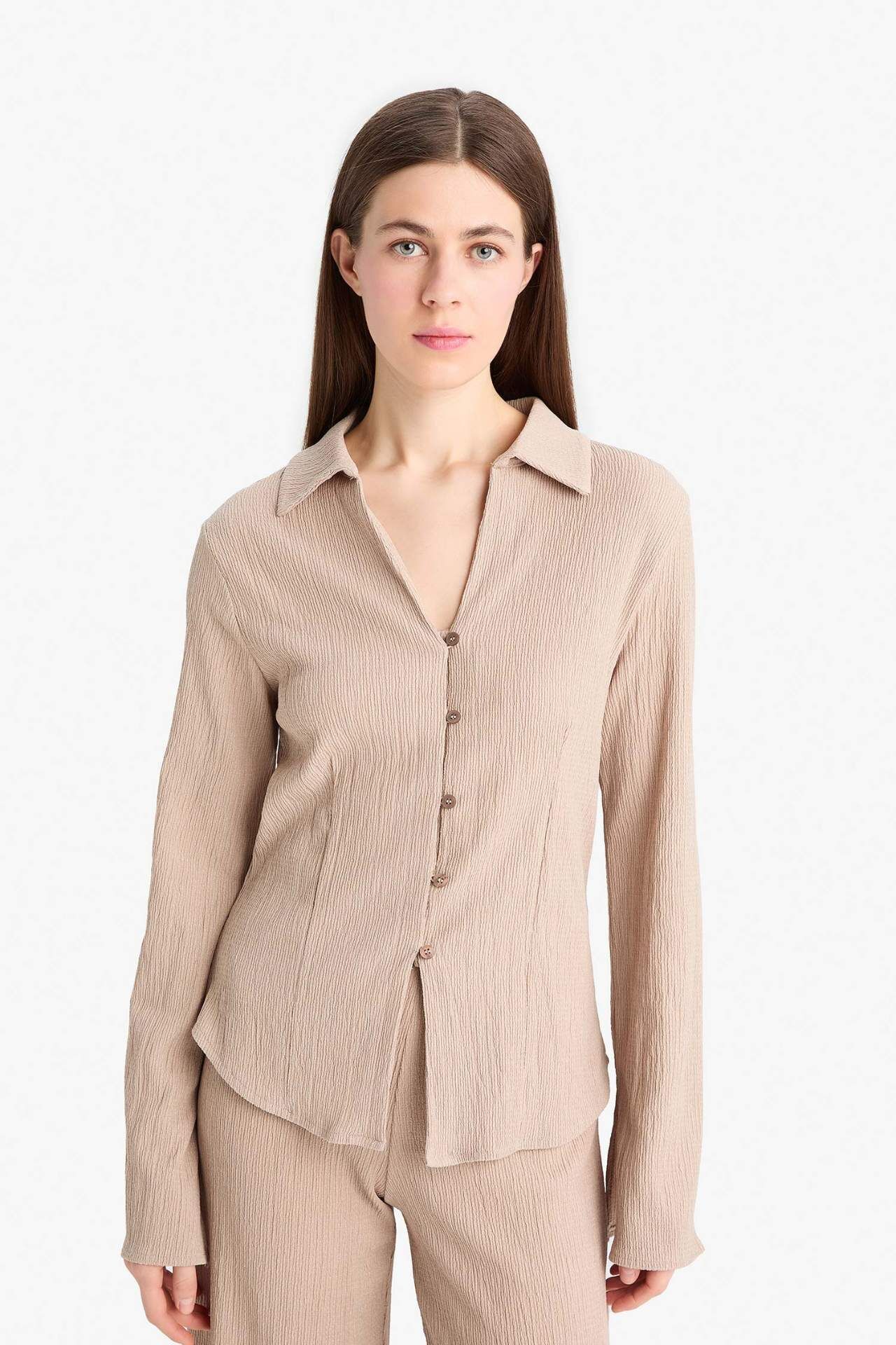 Regular Fit Gömlek Yaka Bürümcük Uzun Kollu Bluz