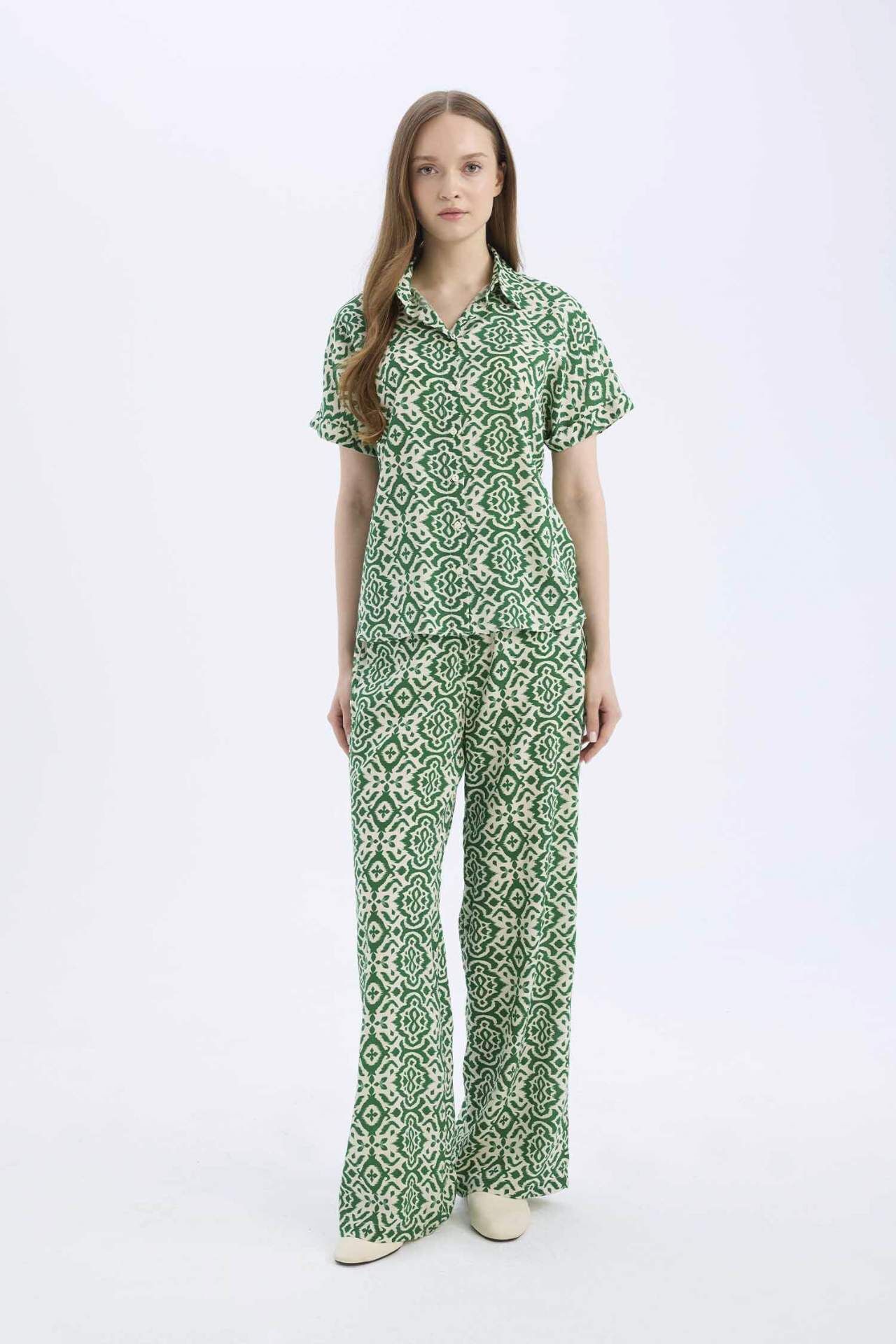 Regular Fit Desenli Kısa Kollu Gömlek, canlı desenleri ve rahat kesimiyle yaz stiline hareket katar. Hafif kumaşı sayesinde serinlik sağlar, günlük ve tatil kombinlerinde şık bir tercih sunar. Viskoz 100%,Viskoz 100%,Viskoz 100%,Viskoz 100%,Viskoz 100% Manken Bedeni: Göğüs: 84 Boy: 1,74 Basen: 92 Bel: 61