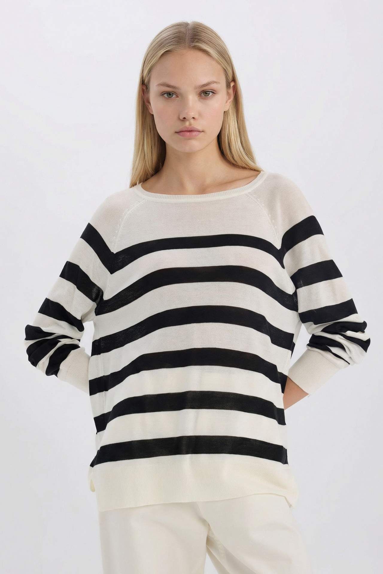 DeFacto Regular Fit Kayık Yaka Çizgili Triko Kazak