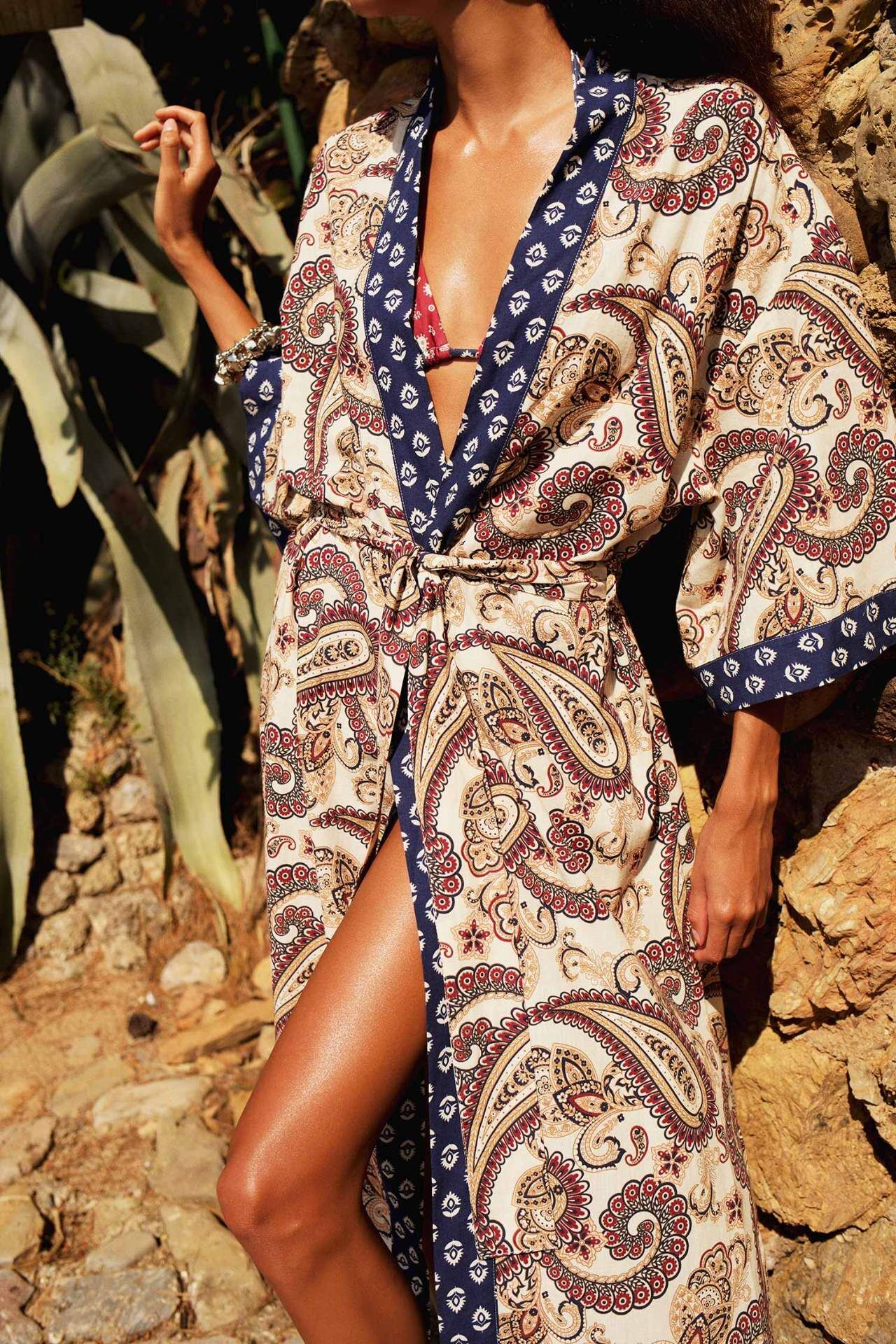 Regular Fit Kuşaklı Etnik Desenli Pamuklu Kimono-Fall in Love