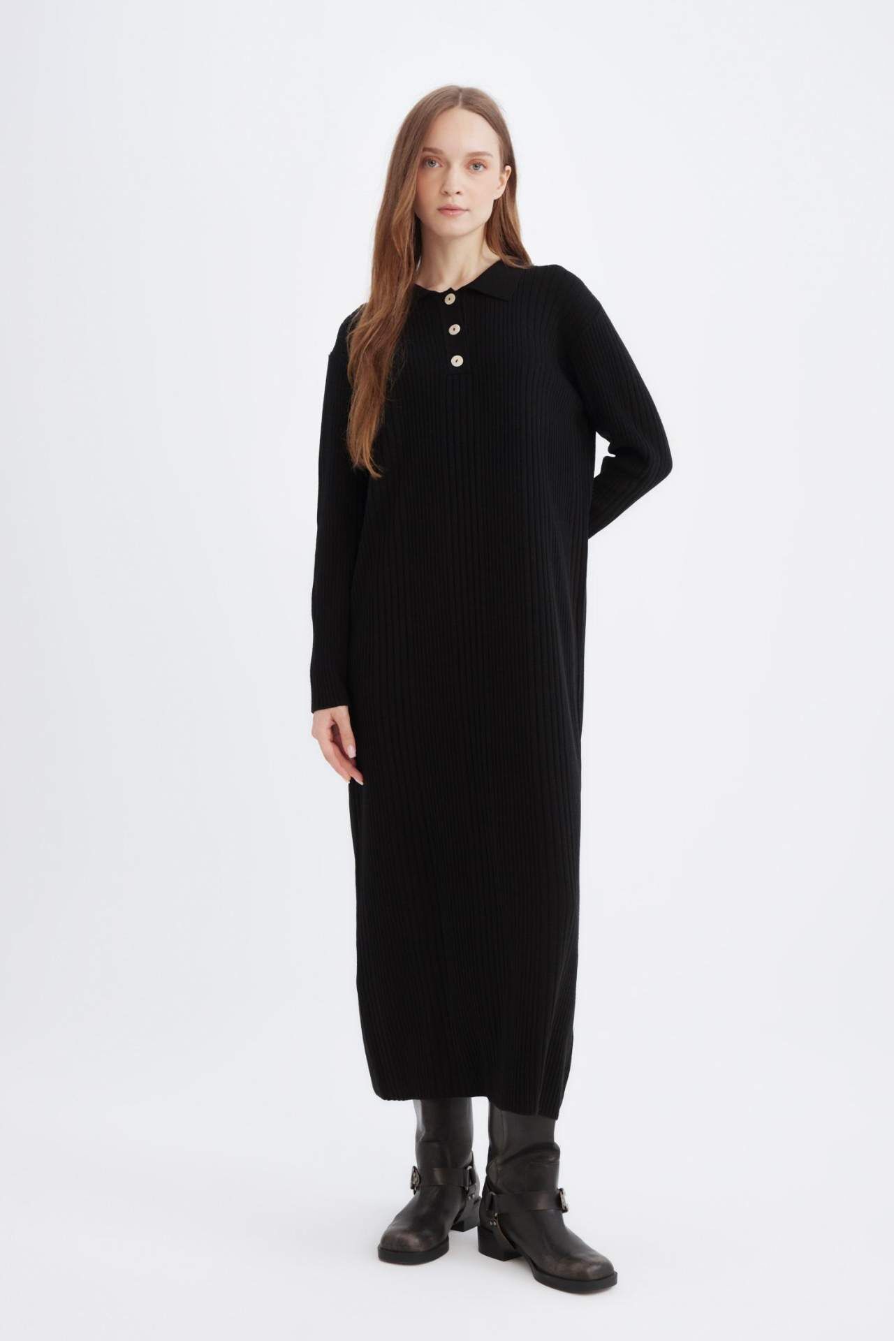 Regular Fit Polo Yaka Basic Düz Maxi Triko Elbise