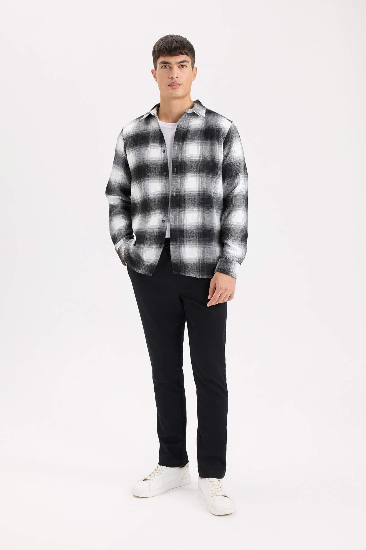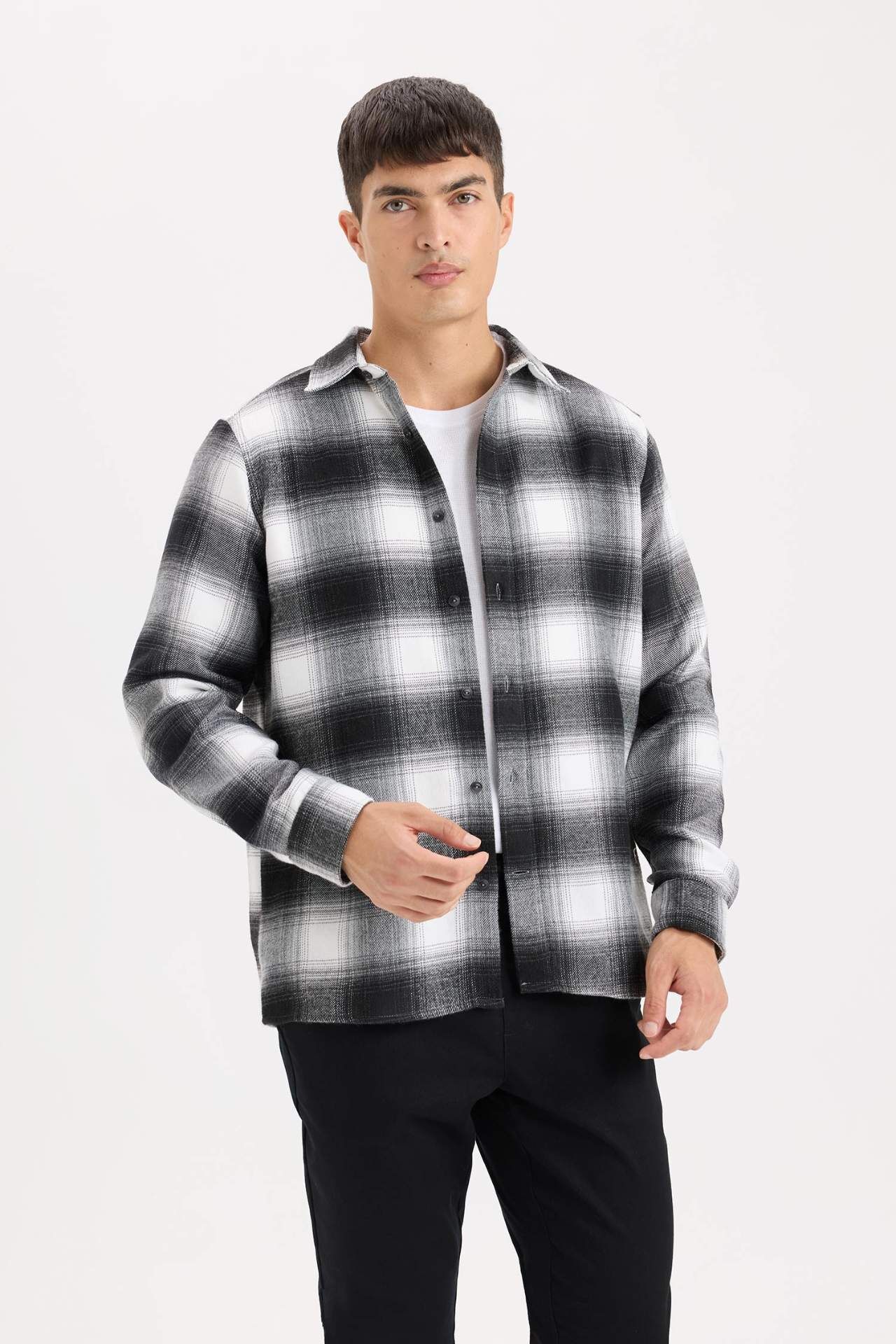 DeFacto Regular Fit Polo Yaka Kareli Flanel Uzun Kollu Gömlek D5835AX24AUBK81
