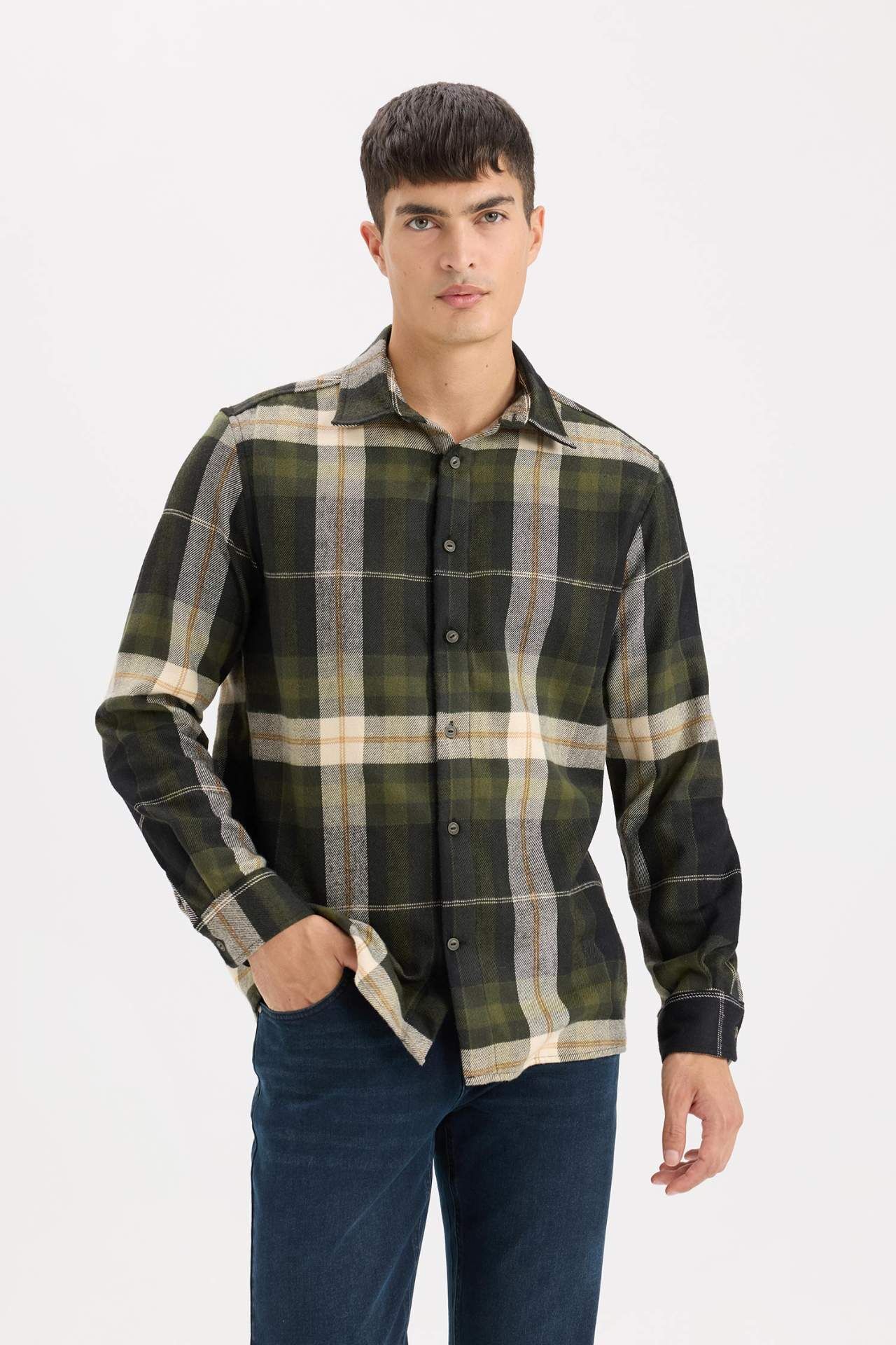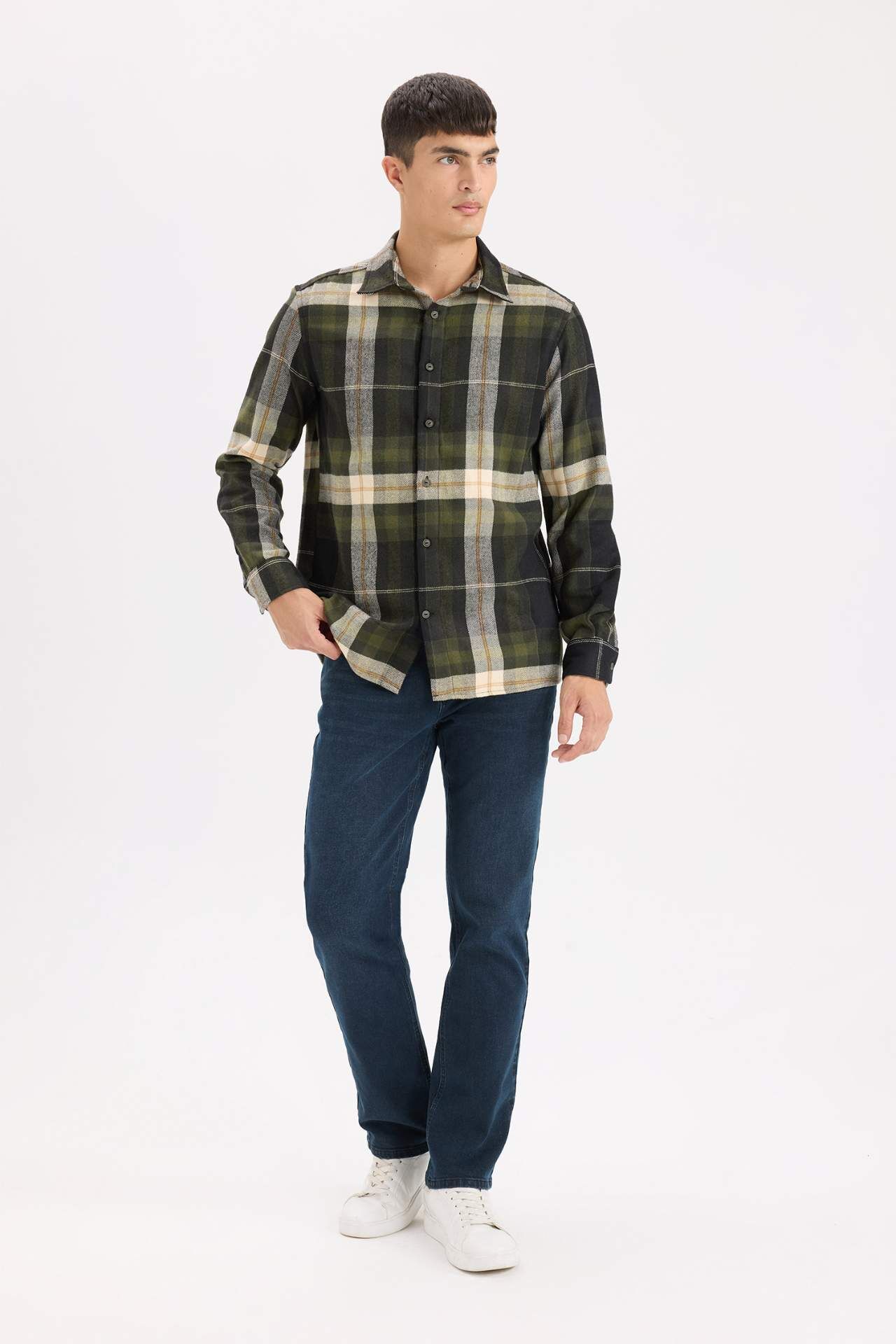 DeFacto Regular Fit Polo Yaka Kareli Flanel Uzun Kollu Gömlek D5835AX24AUNV64