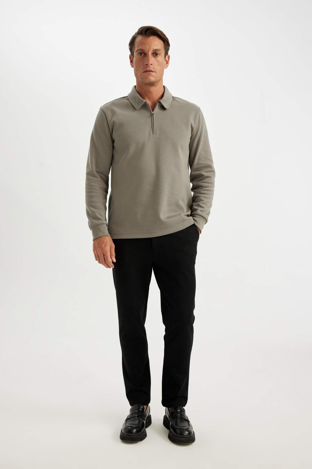 DeFacto Regular Fit Polo Yaka Yarım Fermuarlı Basic Düz Sweatshirt D2279AX24AUGR308