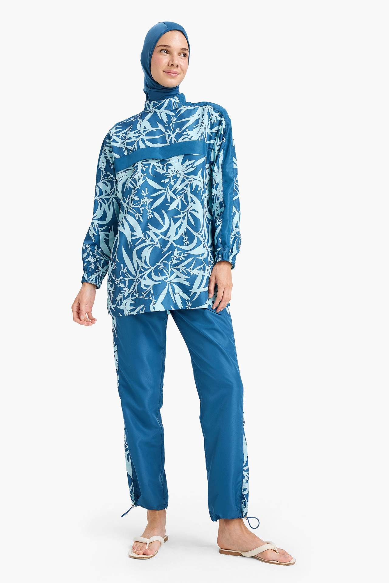Regular Fit Renk Bloklu 3'lü Desenli Burkini Tesettür Mayo Takım