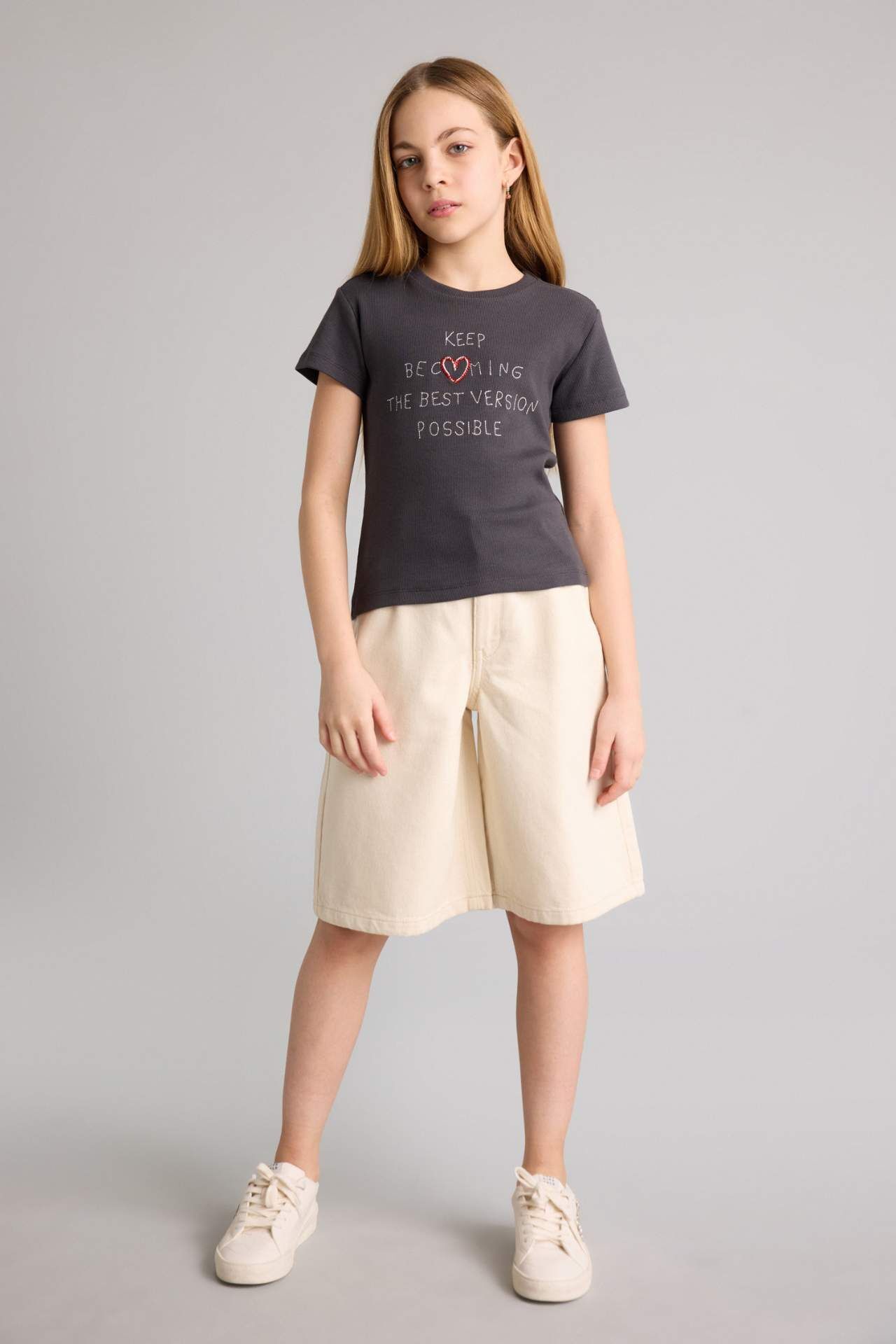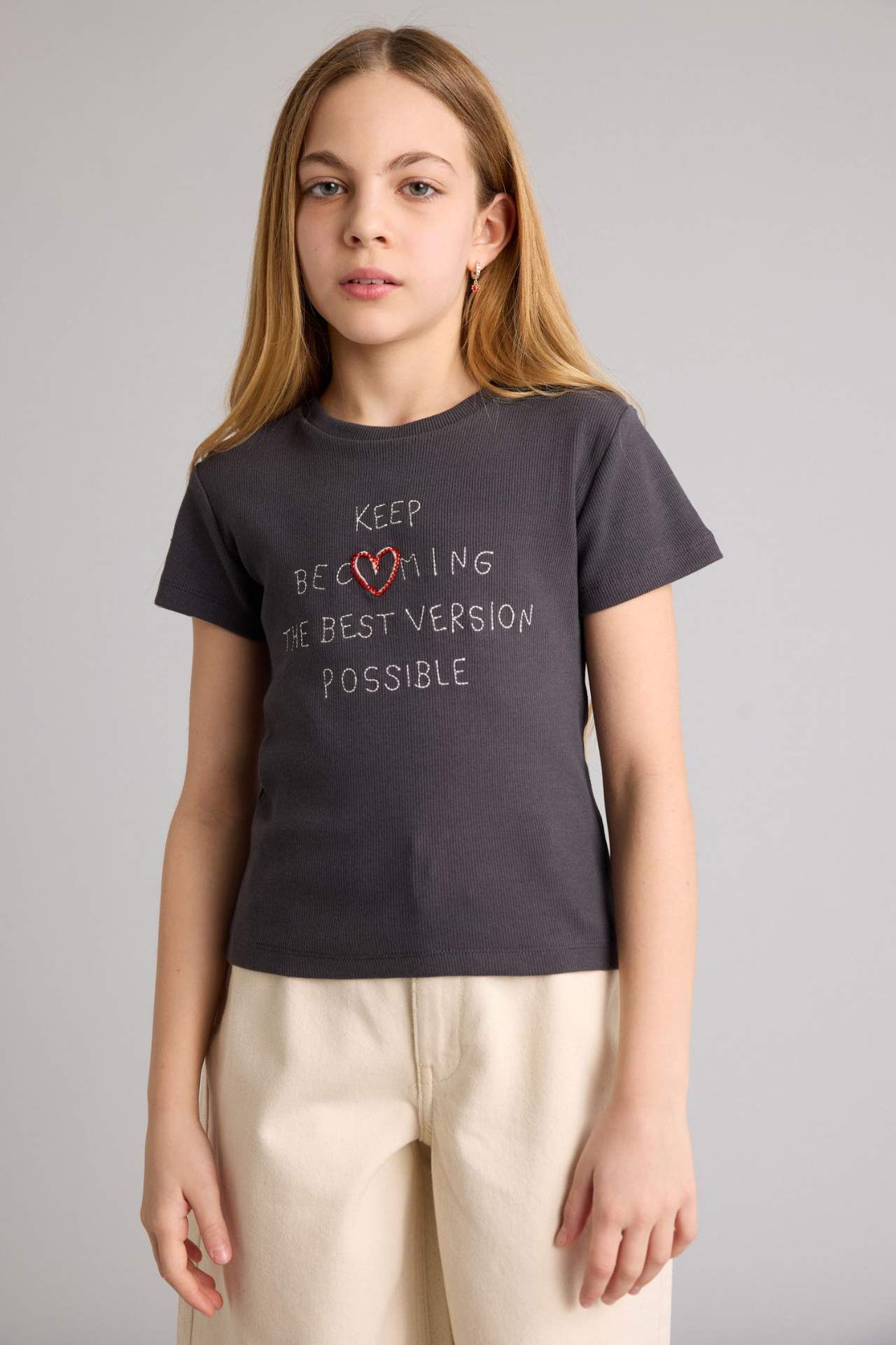 DeFacto Regular Fıt Slogan Baskılı Fitilli Kaşkorse Kısa Kollu Tişört Kız Çocuk
