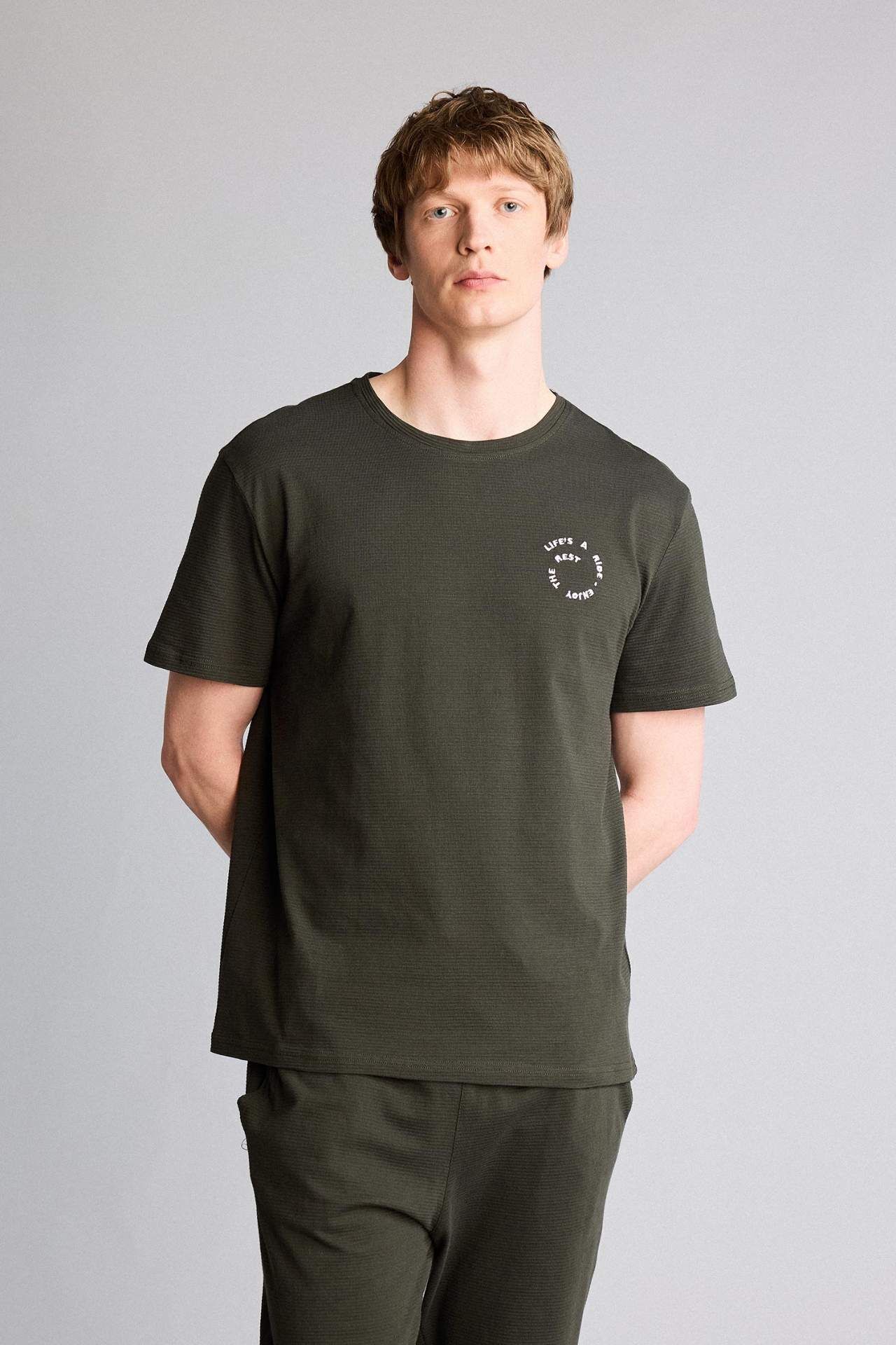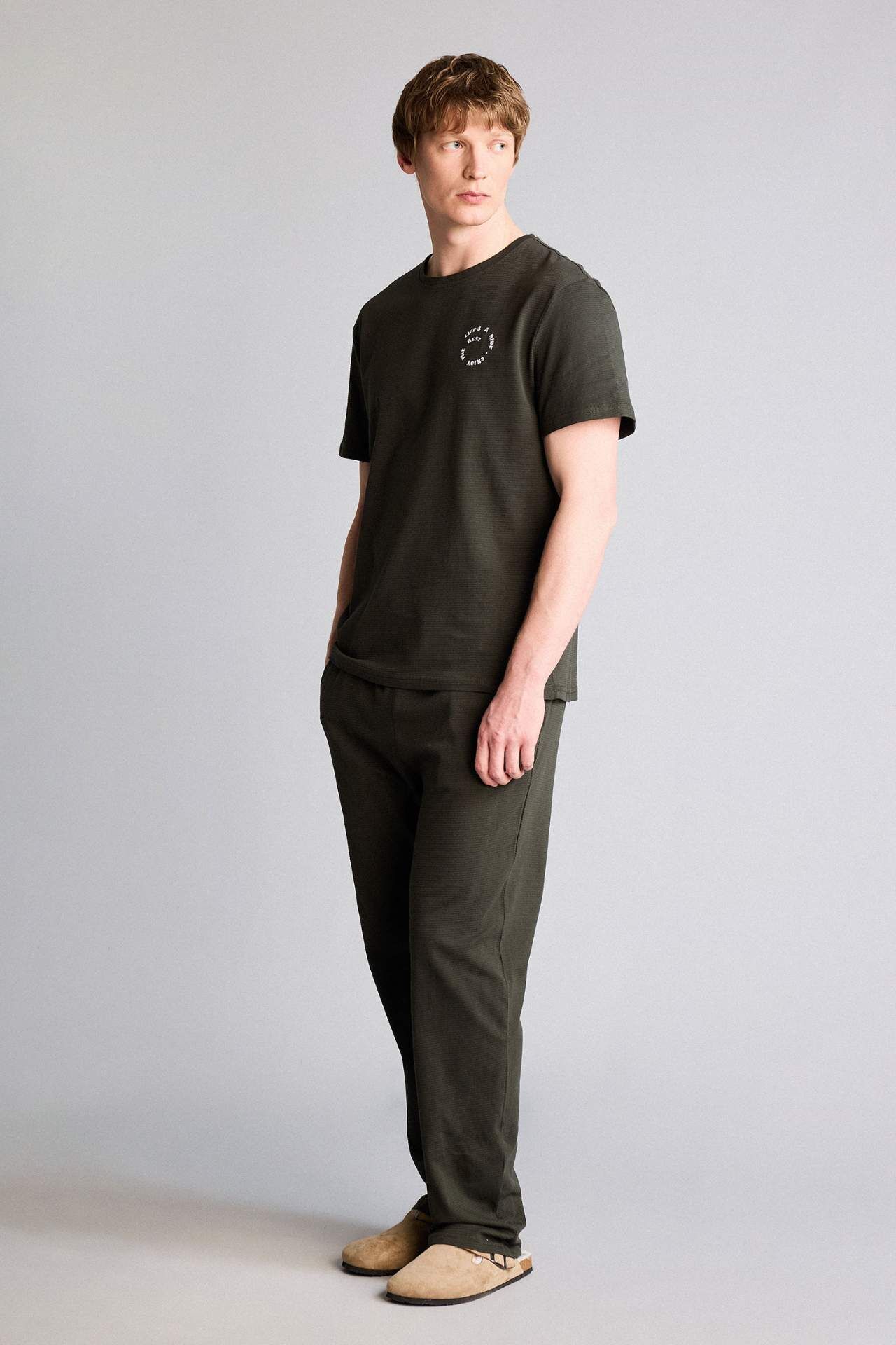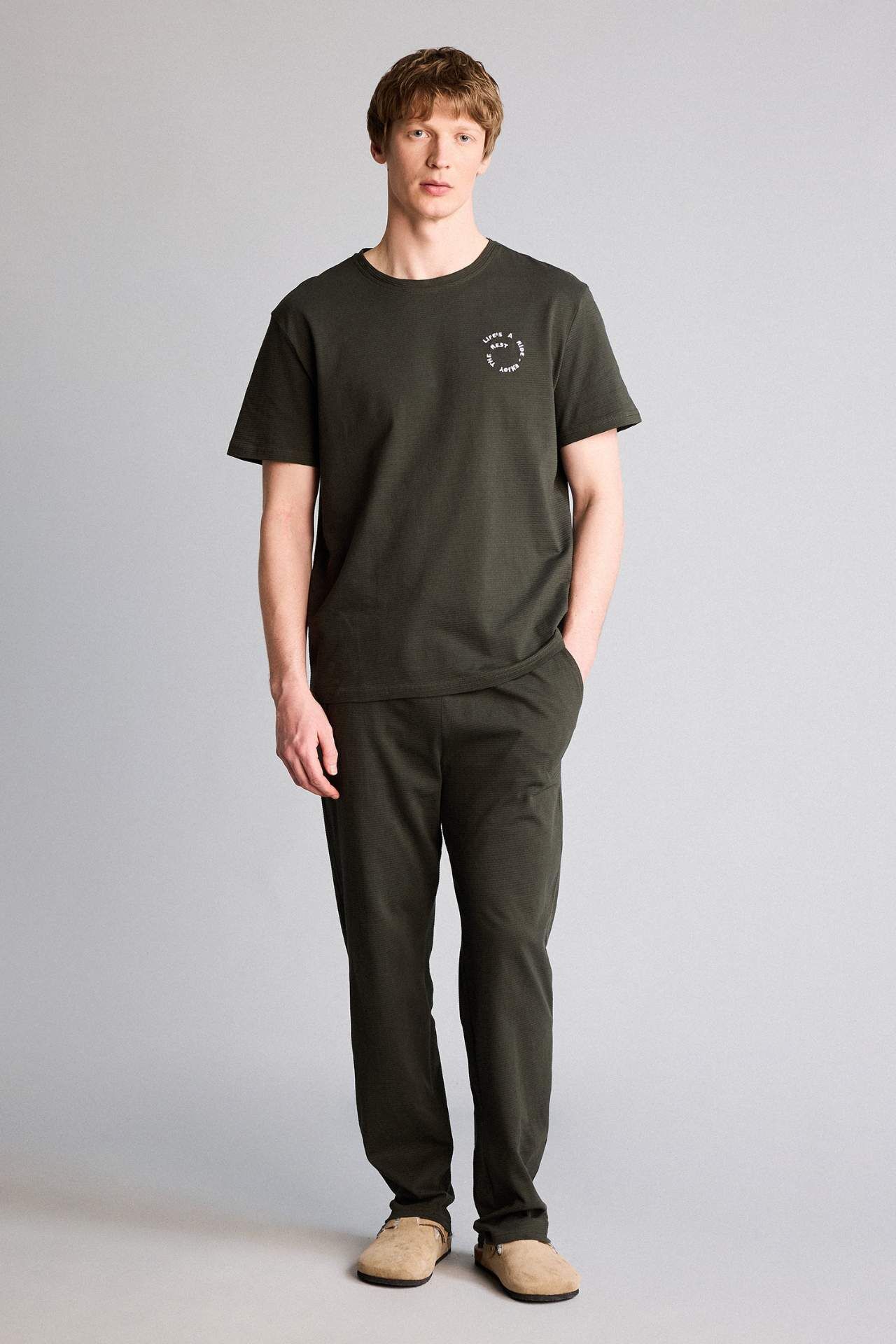 Yetişkin erkekler için, slogan baskılı haki renkli kısa kollu takım. Pamuklu ribana kumaştan üretilmiş, regular fit kesime sahip. Yaz mevsiminde rahatlıkla tercih edebileceğiniz 2'li takım set. Bisiklet yaka detayıyla şıklığı ve konforu bir arada sunar. Uzun boylu ve temel çeşit arayışındaysanız ideal bir seçenek. Pamuk 100%,Pamuk 100% Manken Bedeni: Göğüs: 83 Boy: 1,83 Basen: 90 Bel: 64