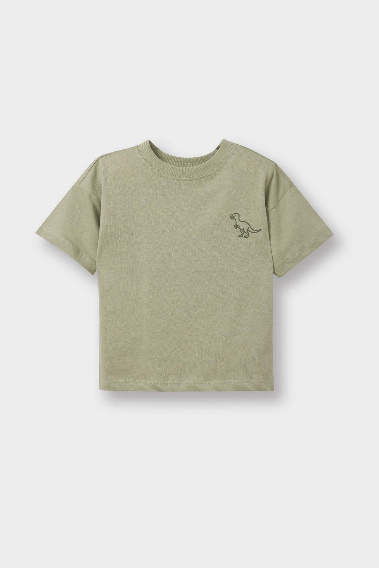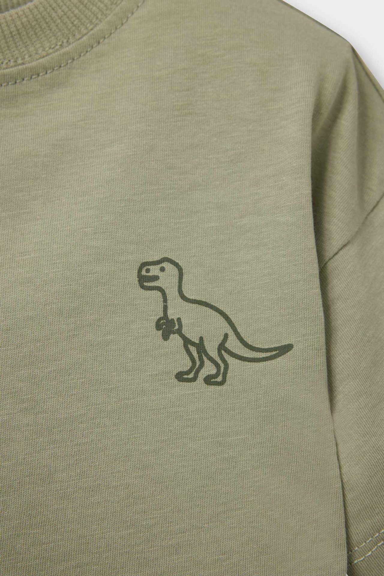 Yumuşak ve nefes alabilen pamuklu kumaşı gün boyu konfor sağlar. Canlı dinozor baskısı, eğlenceli ve dikkat çekici bir görünüm sunar. Pamuk 100%