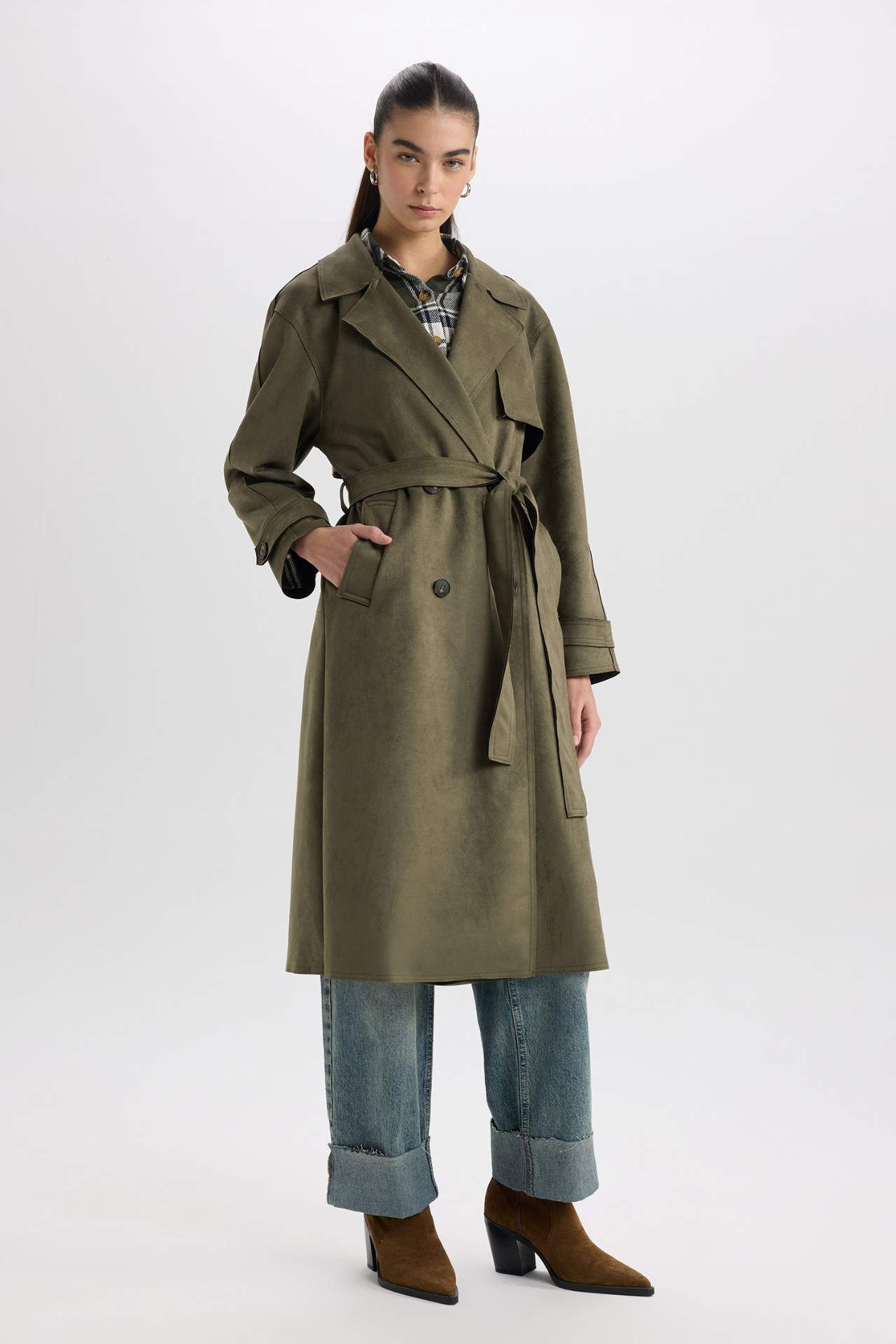 Regular Fit Smokin Yaka Kemerli Cepli Uzun Süet Trençkot