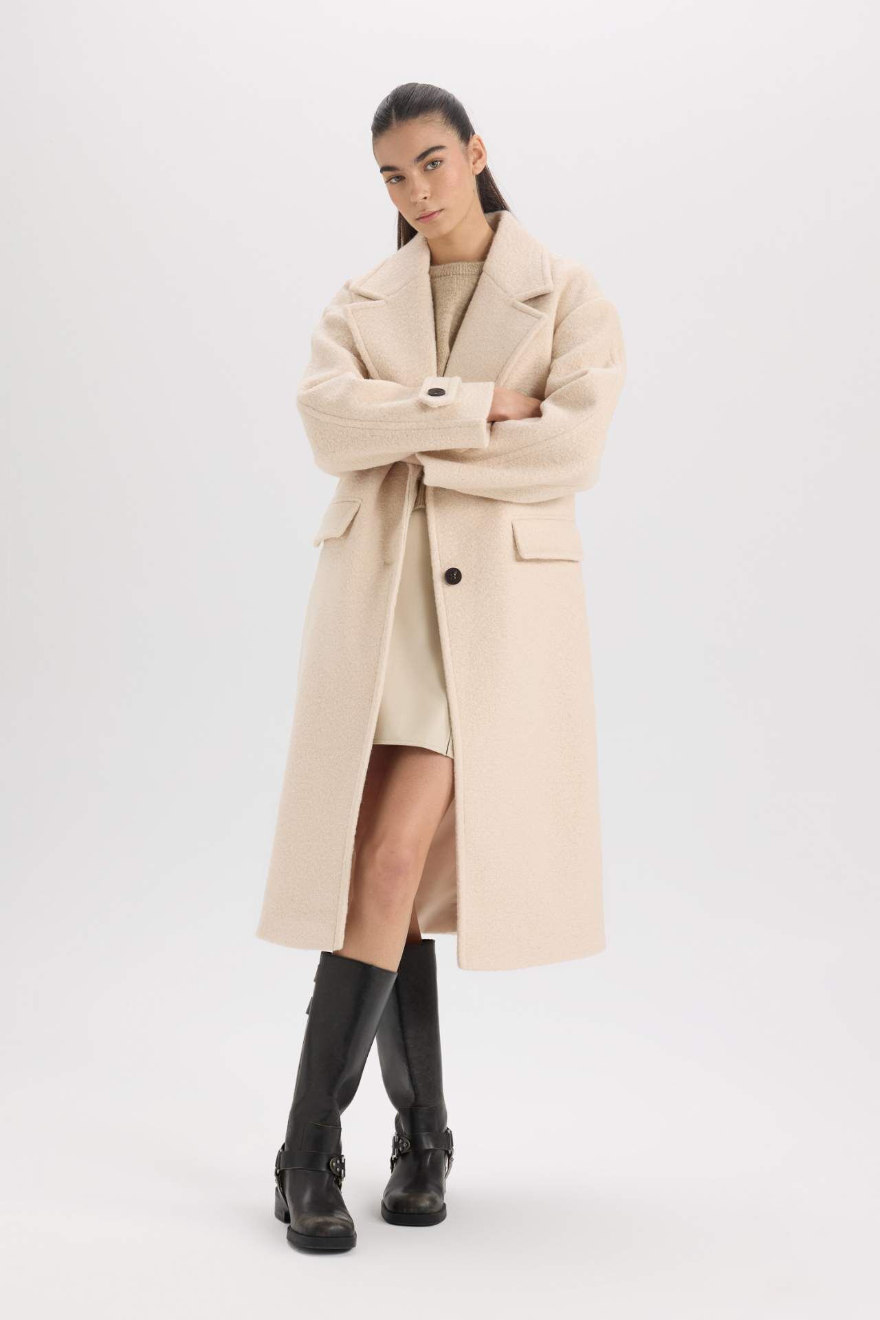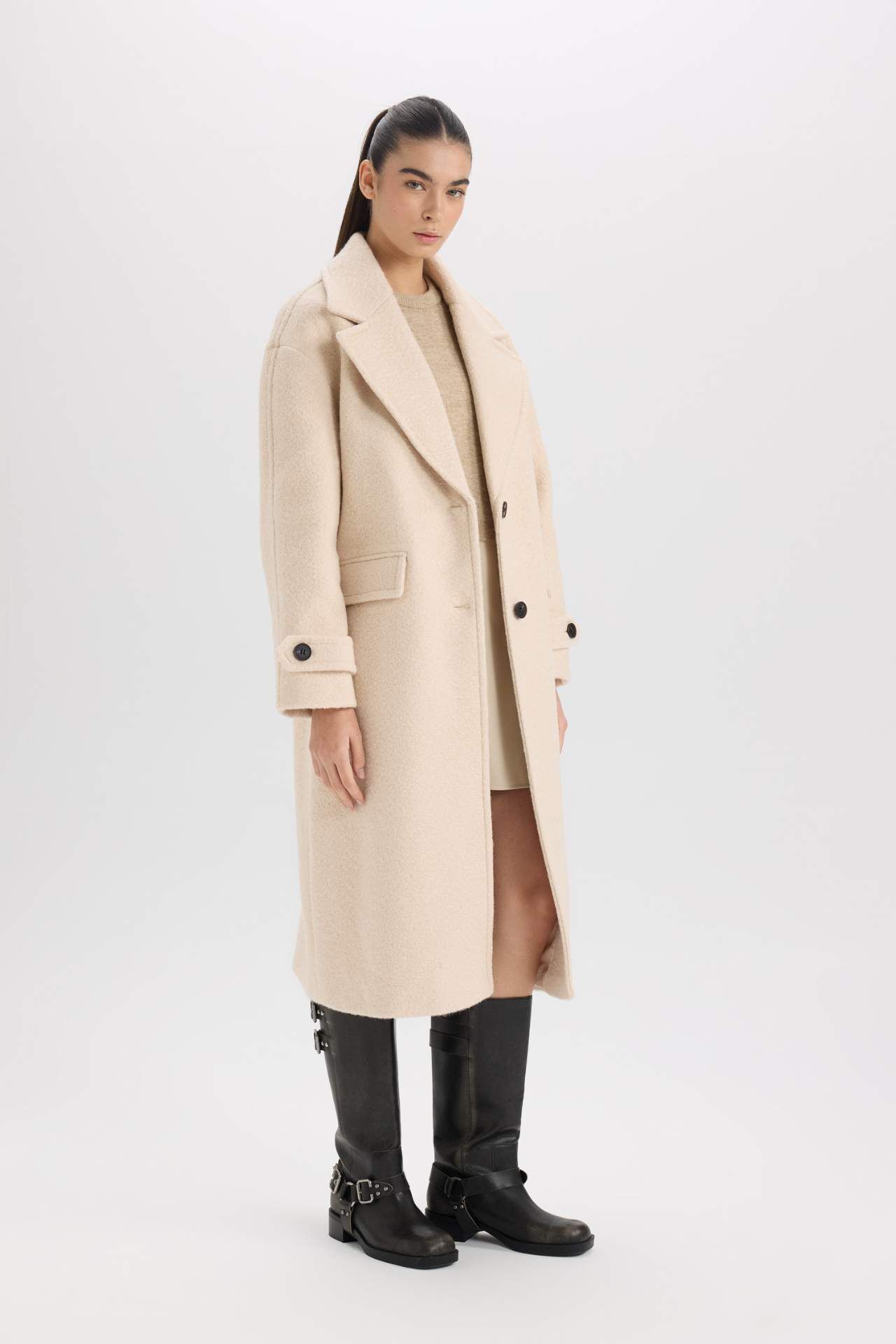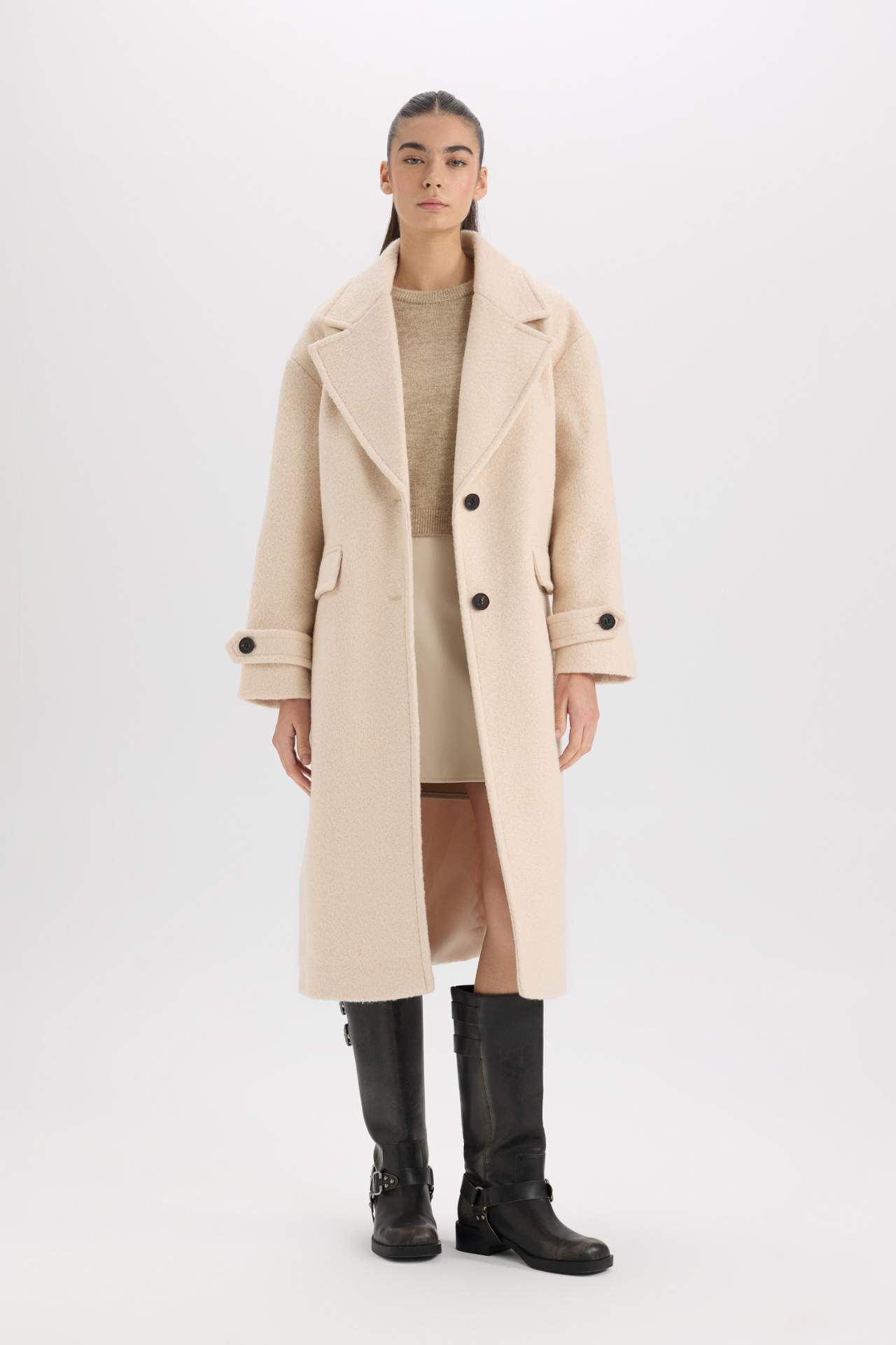 DeFacto Regular Fit Uzun Kaşe Kaban Apoletli Ceket Yaka Cepli Düğmeli