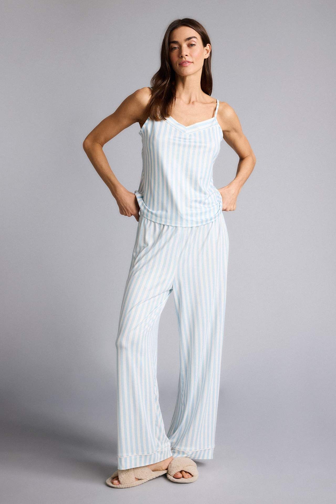 Çizgili askılı üst, dinamik çizgileriyle enerjik bir görünüm sunar. Hafif ve rahat yapısı sayesinde sıcak günlerde şıklığı ve konforu bir arada yaşatır. Elastan 6%,Poliester 94% Manken Bedeni: Göğüs: 89 Boy: 1,78 Basen: 92 Bel: 63