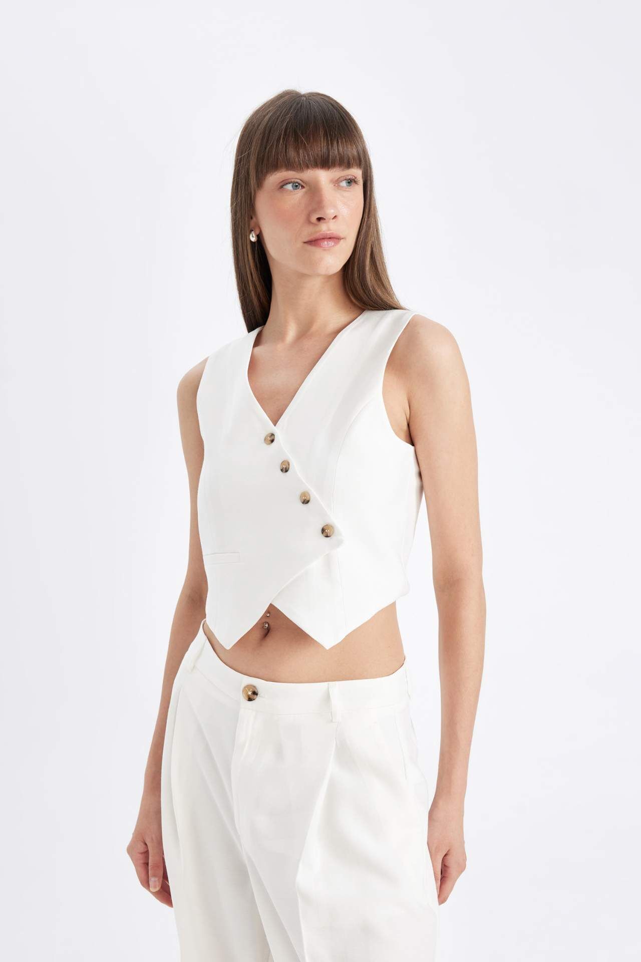 Regular Fit V Yaka Beyaz Tensel Blazer Yelek