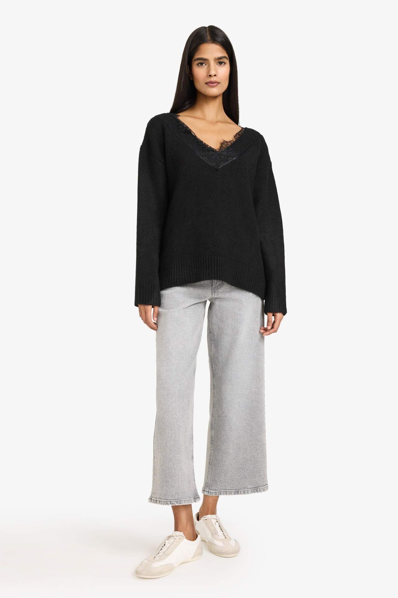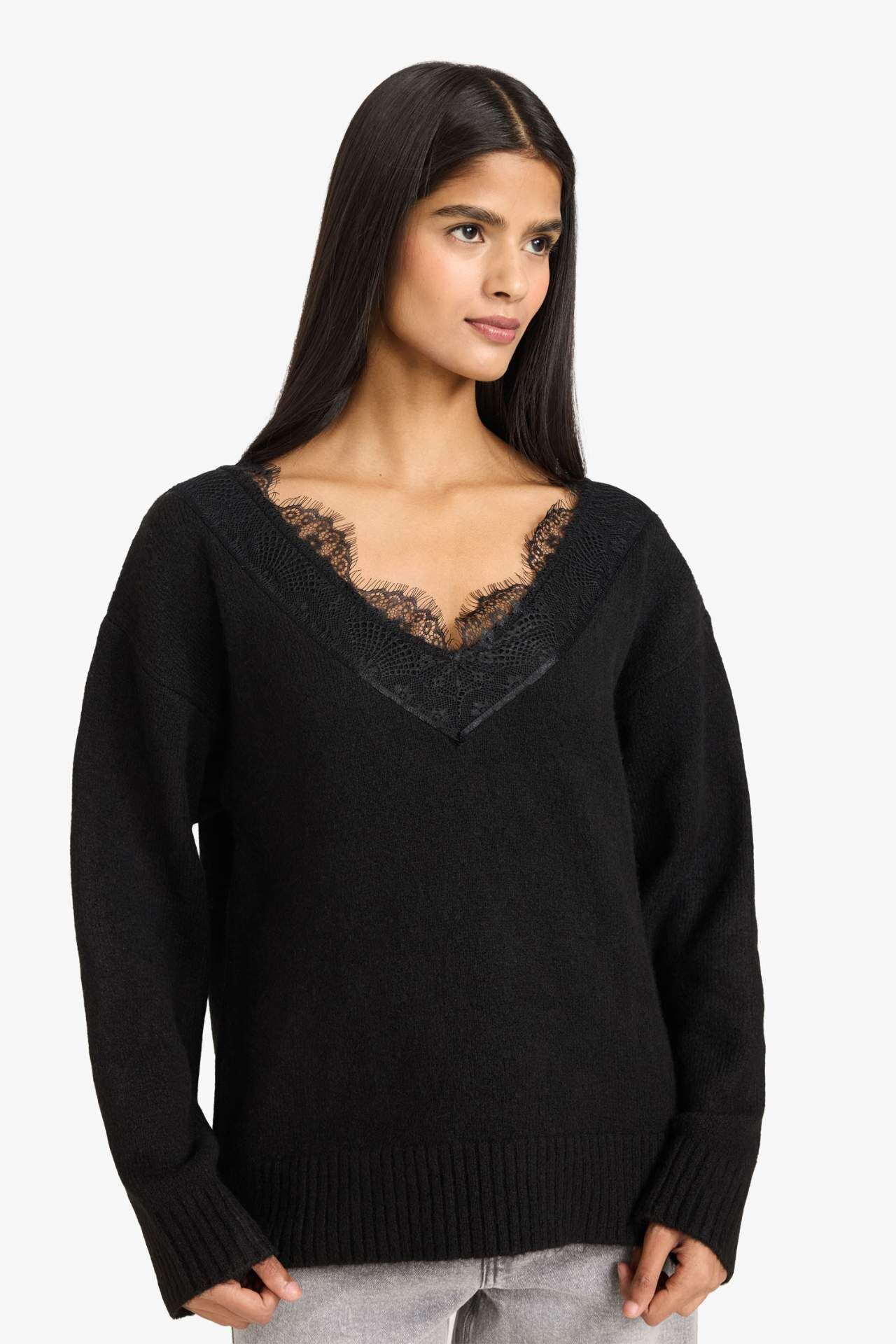 Regular Fit V Yaka Dantel Detaylı Triko Kazak