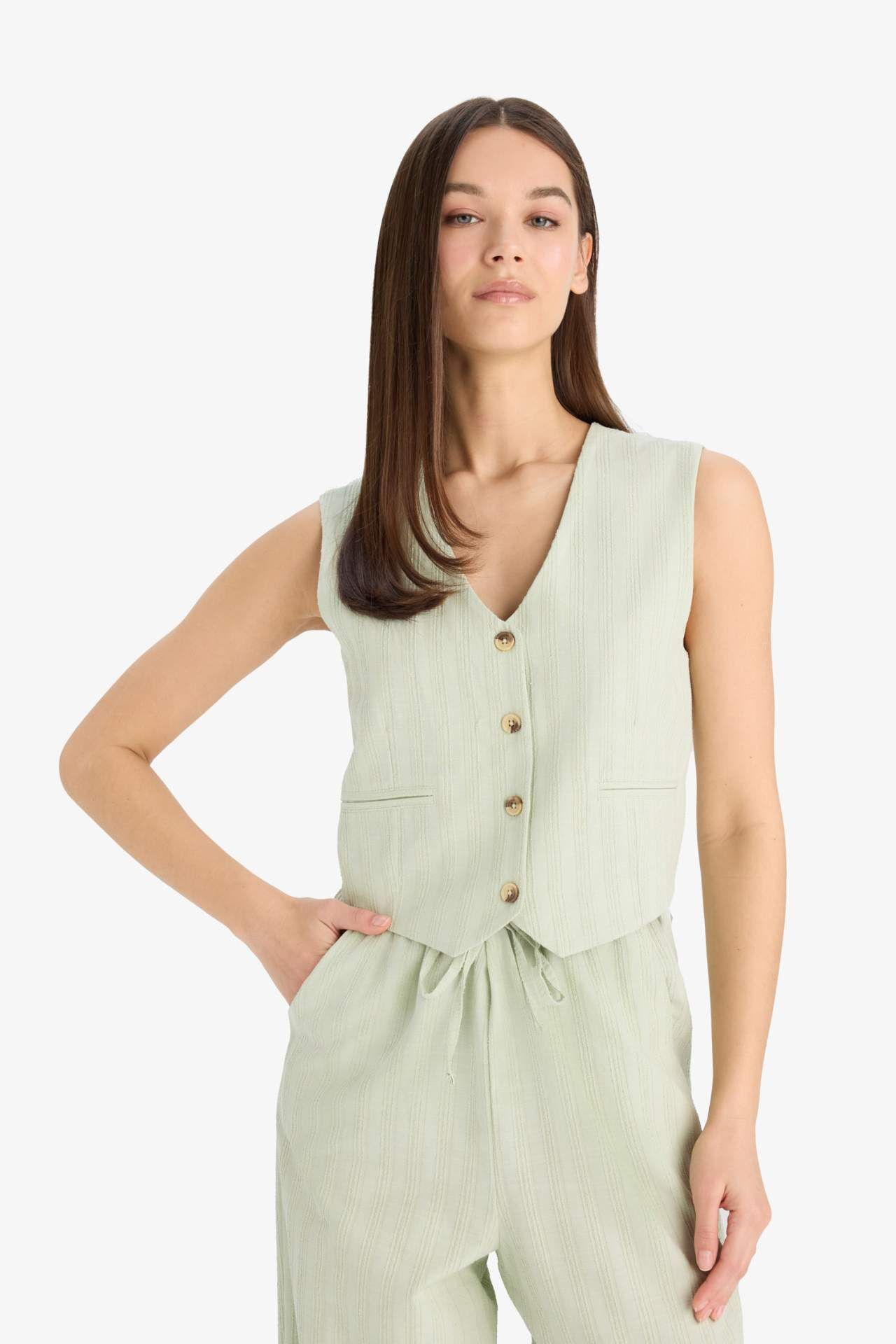 Regular Fit V Yaka Keten Karışımlı Blazer Yelek D3474AX25SPGN1181