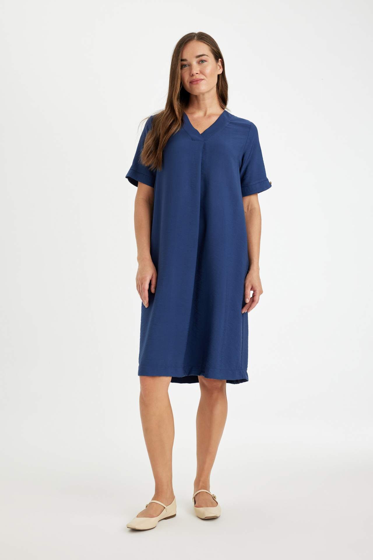 Regular Fit V Yaka Kısa Kollu Midi Elbise