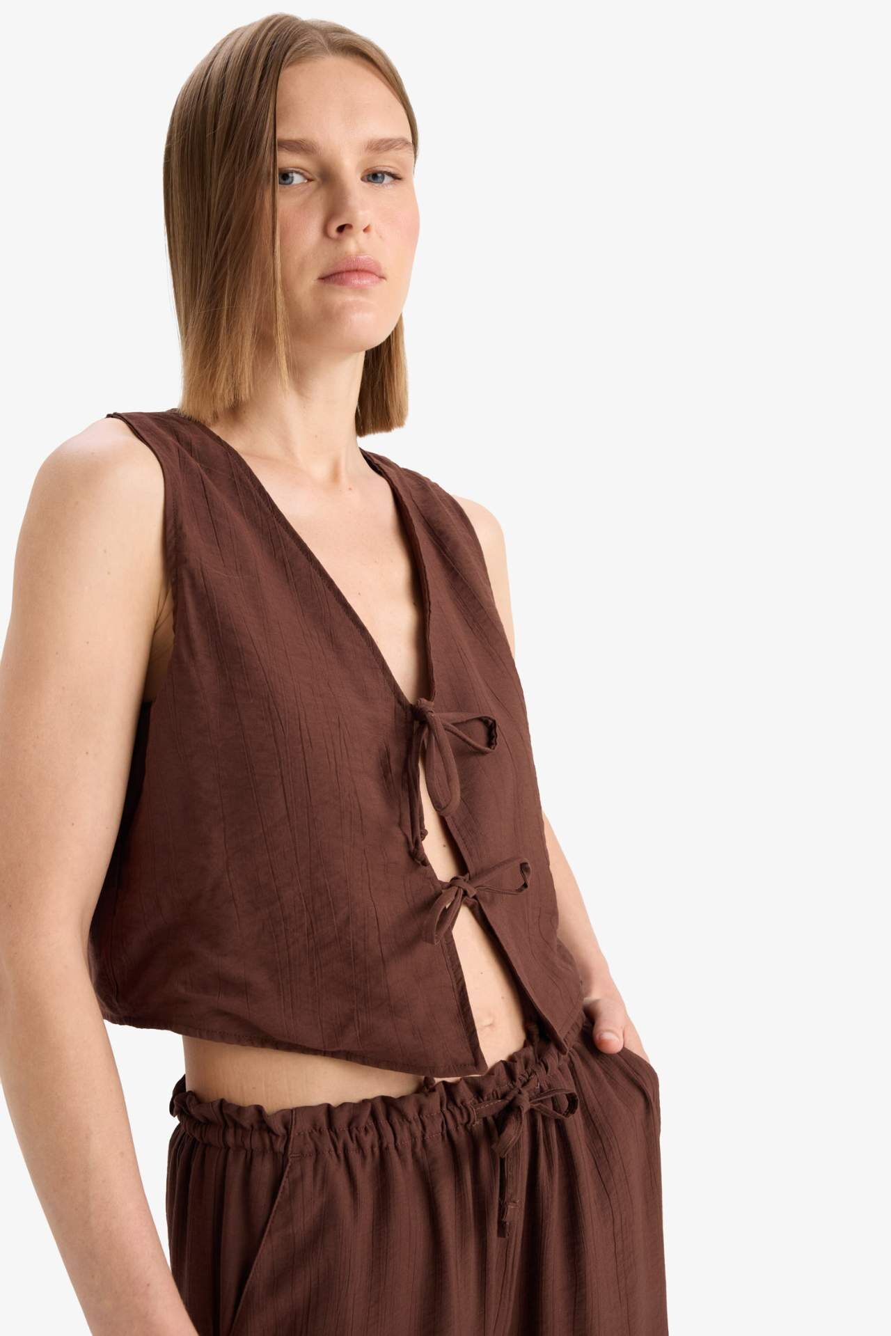 Regular Fit V Yaka Krinkıl Kumaş Kolsuz Bluz