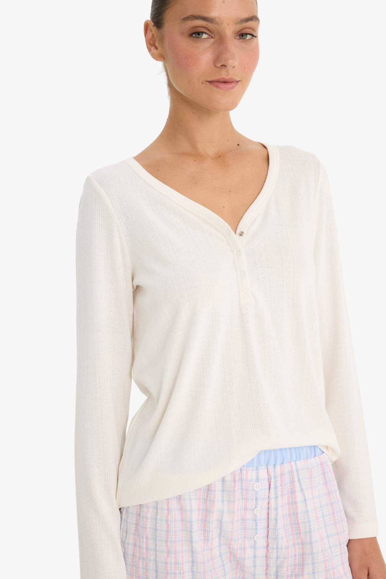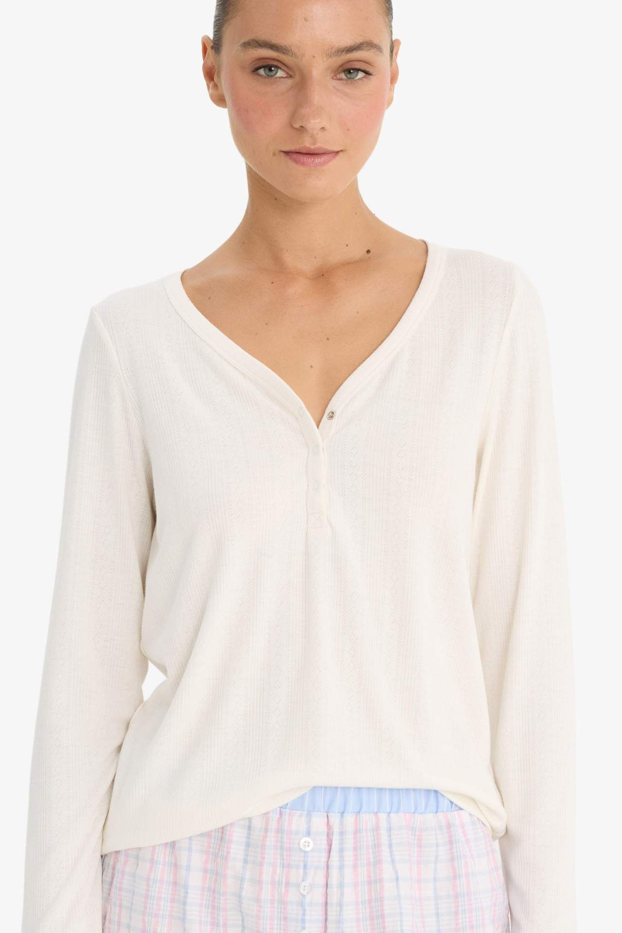 Regular fit kesimi ve V yaka tasarımıyla bu uzun kollu pijama üstü, rahat ve şık bir uyku deneyimi sunar. Yumuşak kumaşı sayesinde gün boyu konfor sağlar. Elastan 4%,Viskoz 34%,Poliester 62%,Elastan 4%,Viskoz 34%,Poliester 62%