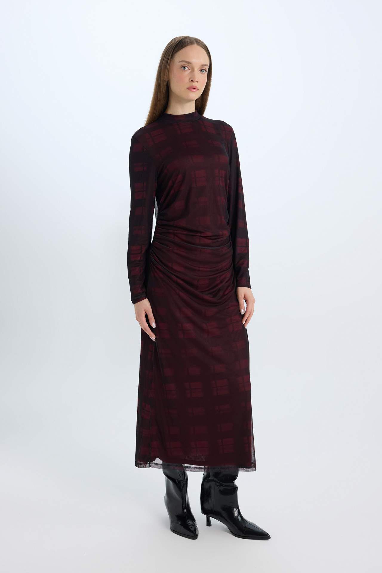 Regular Fit Yarım Balıkçı Yaka Desenli Uzun Kollu Maxi Tül Elbise