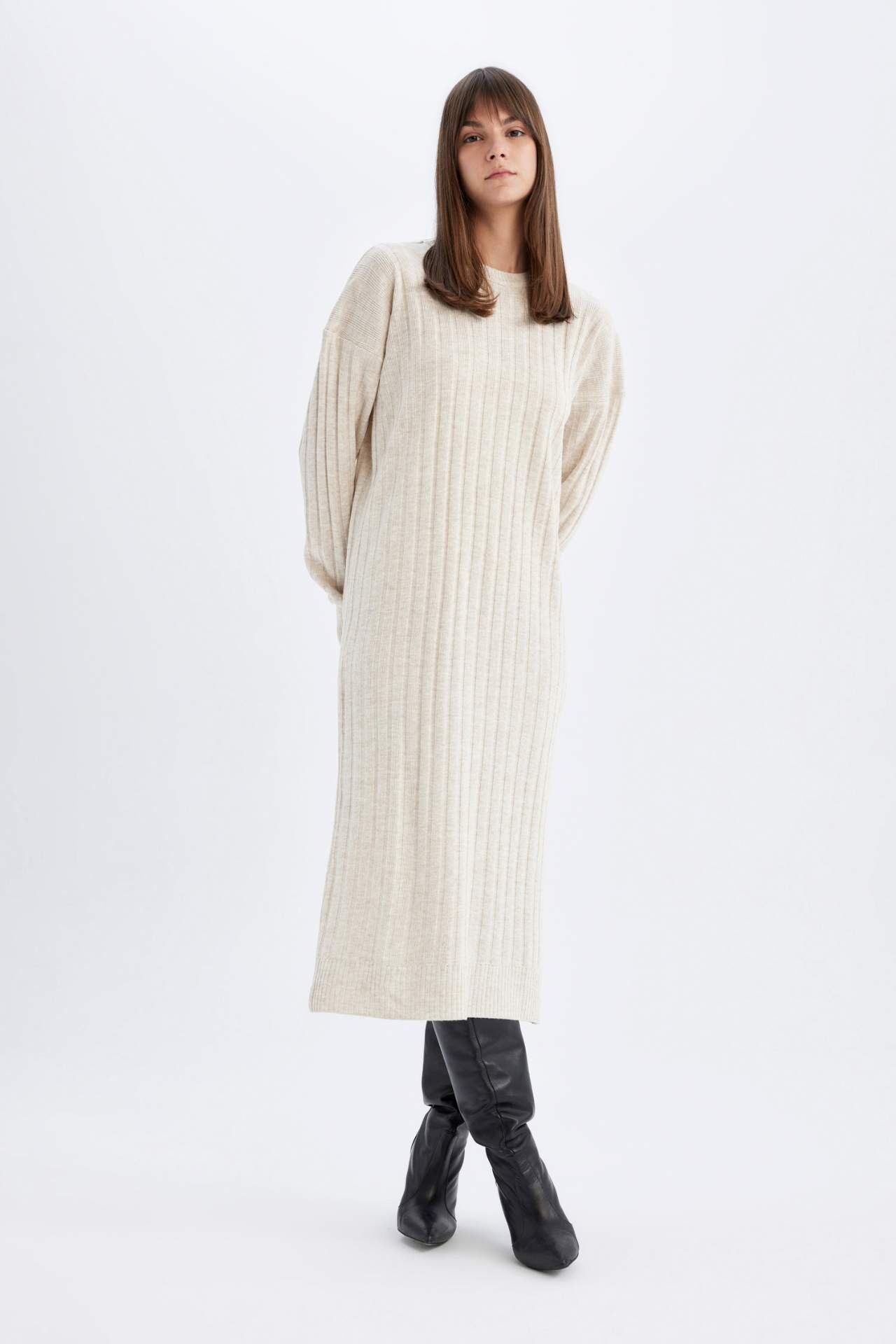 Regular Fit Yarım Balıkçı Yaka Uzun Kollu Midi Elbise