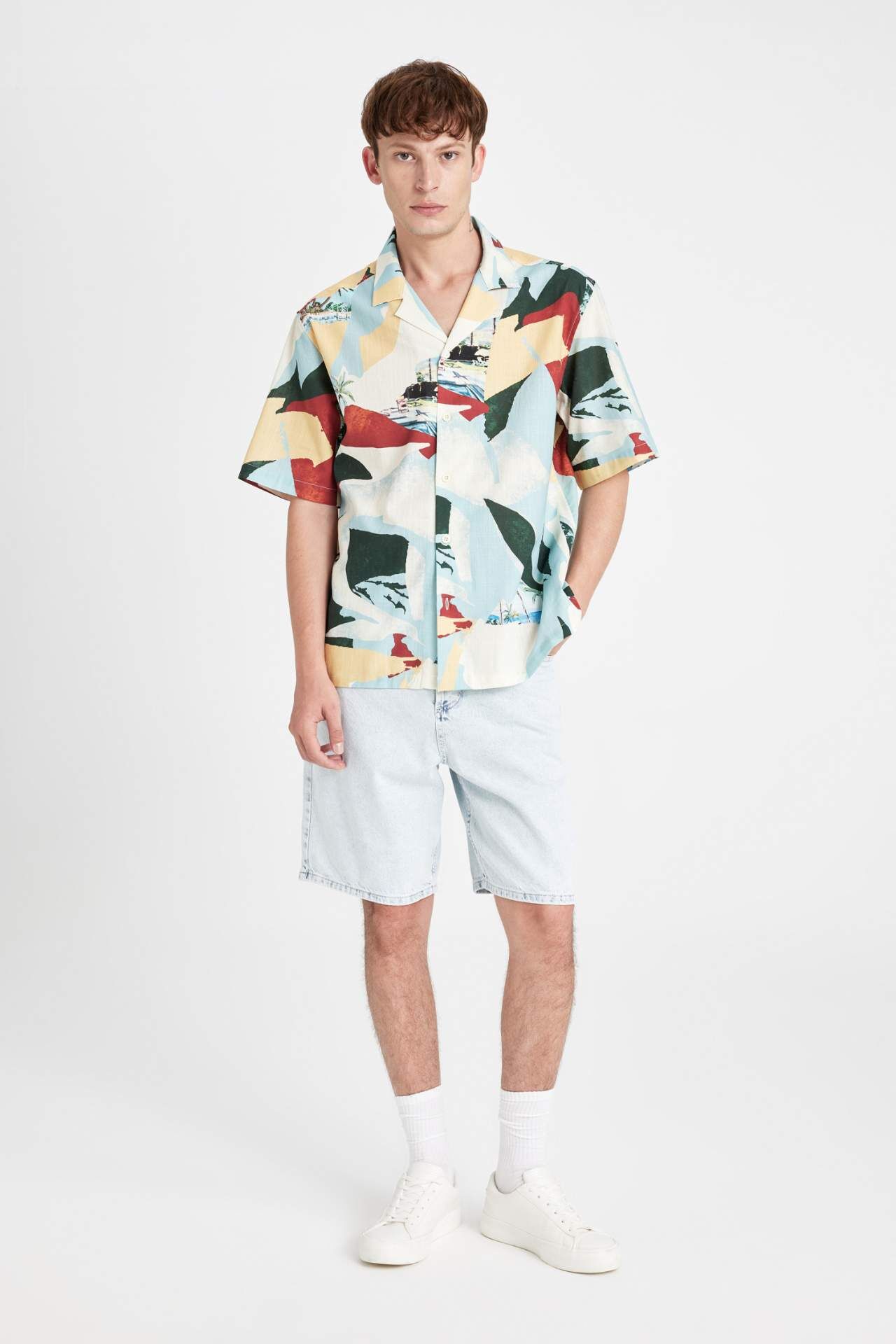 DeFacto Relax Fit Apaş Yaka Baskılı Pamuklu Kısa Kollu Gömlek