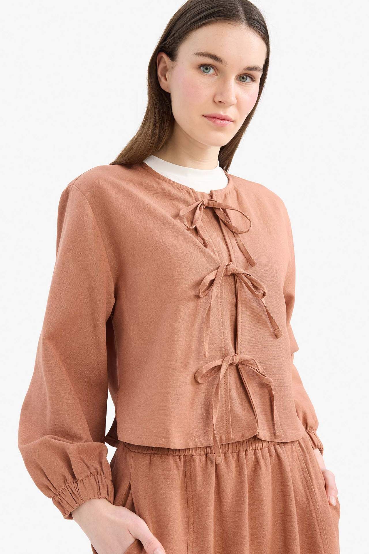 Relax Fit Bağcıklı Keten Uzun Kollu Bluz