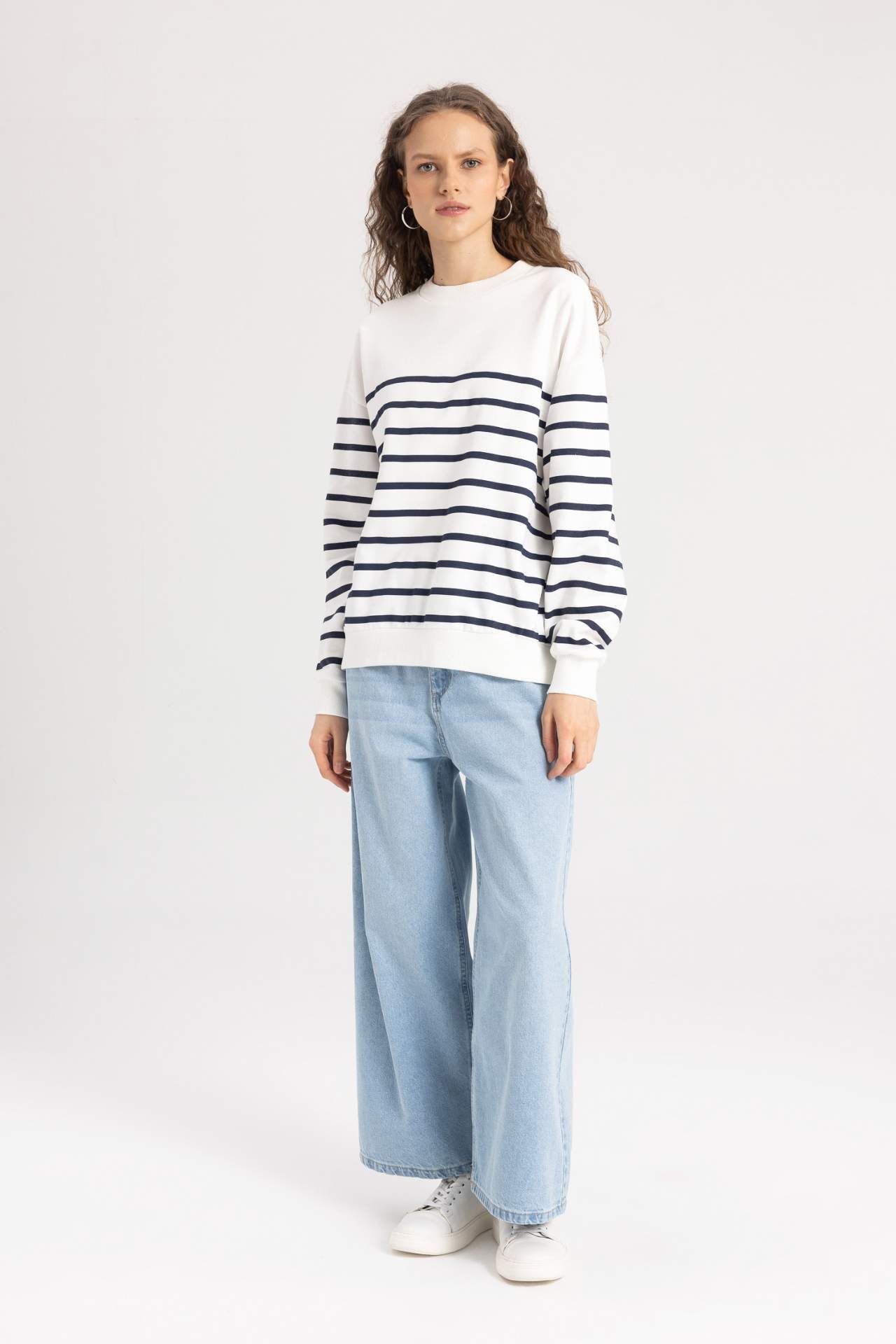 DeFacto Relax Fit Bisiklet Yaka Çizgili İnce Sweatshirt Kumaşı Sweatshirt