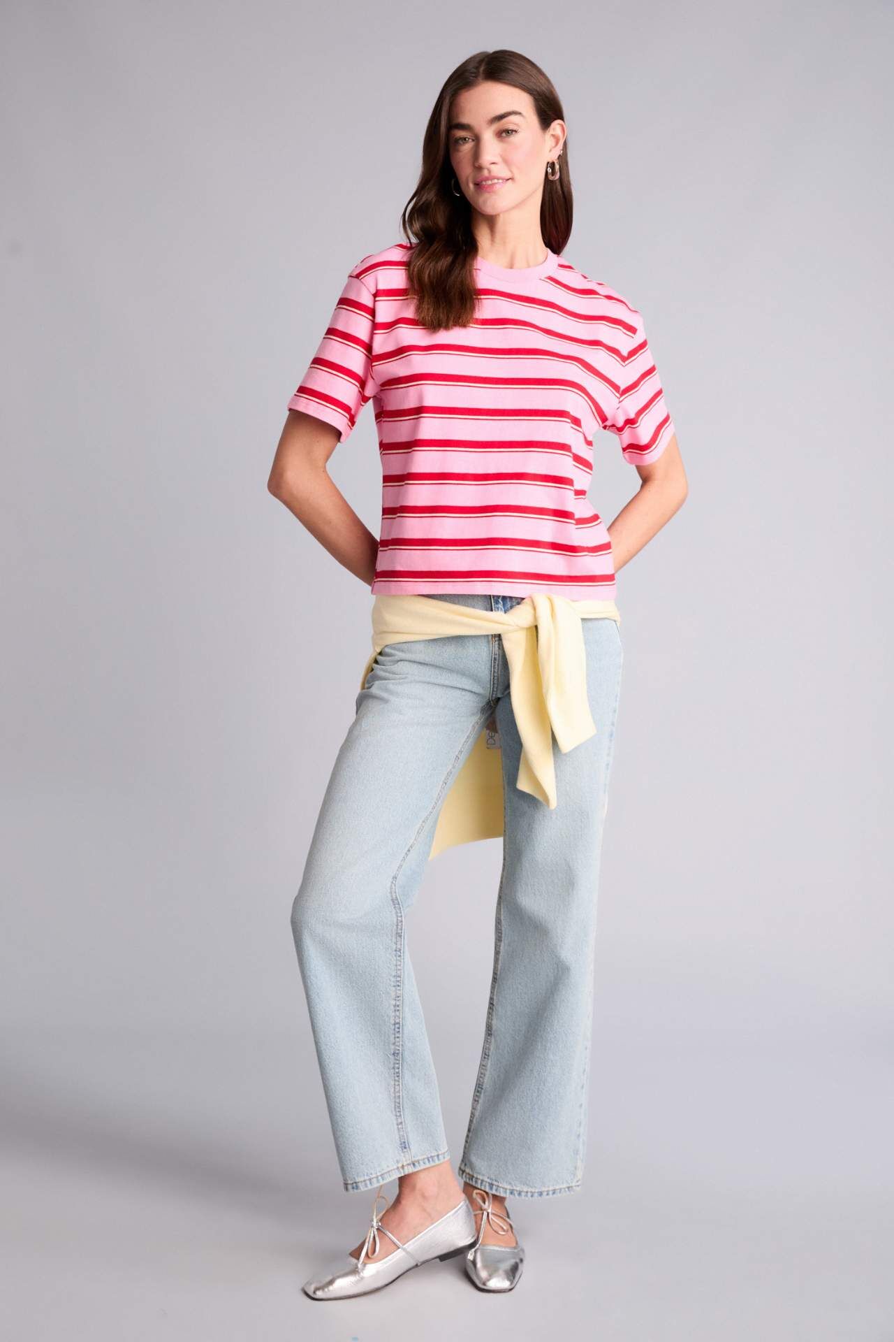 Yetişkin kadınlar için yaz aylarında rahatlıkla tercih edebileceğiniz çizgili pembe kısa kollu tişört. Bisiklet yaka ve relax fit kalıbıyla öne çıkan baskılı tasarım. Şıklığı ve konforu bir arada sunar. Bu sezonun favorisi! Pamuk 100% Manken Bedeni: Göğüs: 89 Boy: 1,78 Basen: 92 Bel: 63