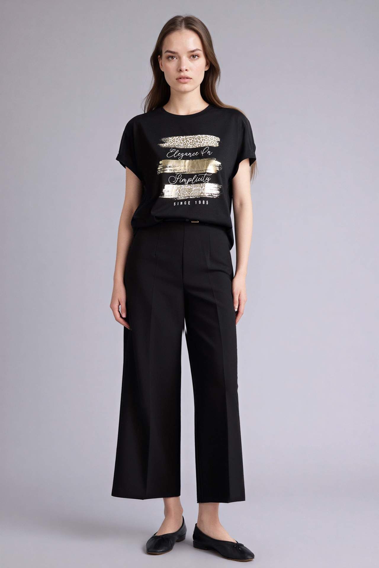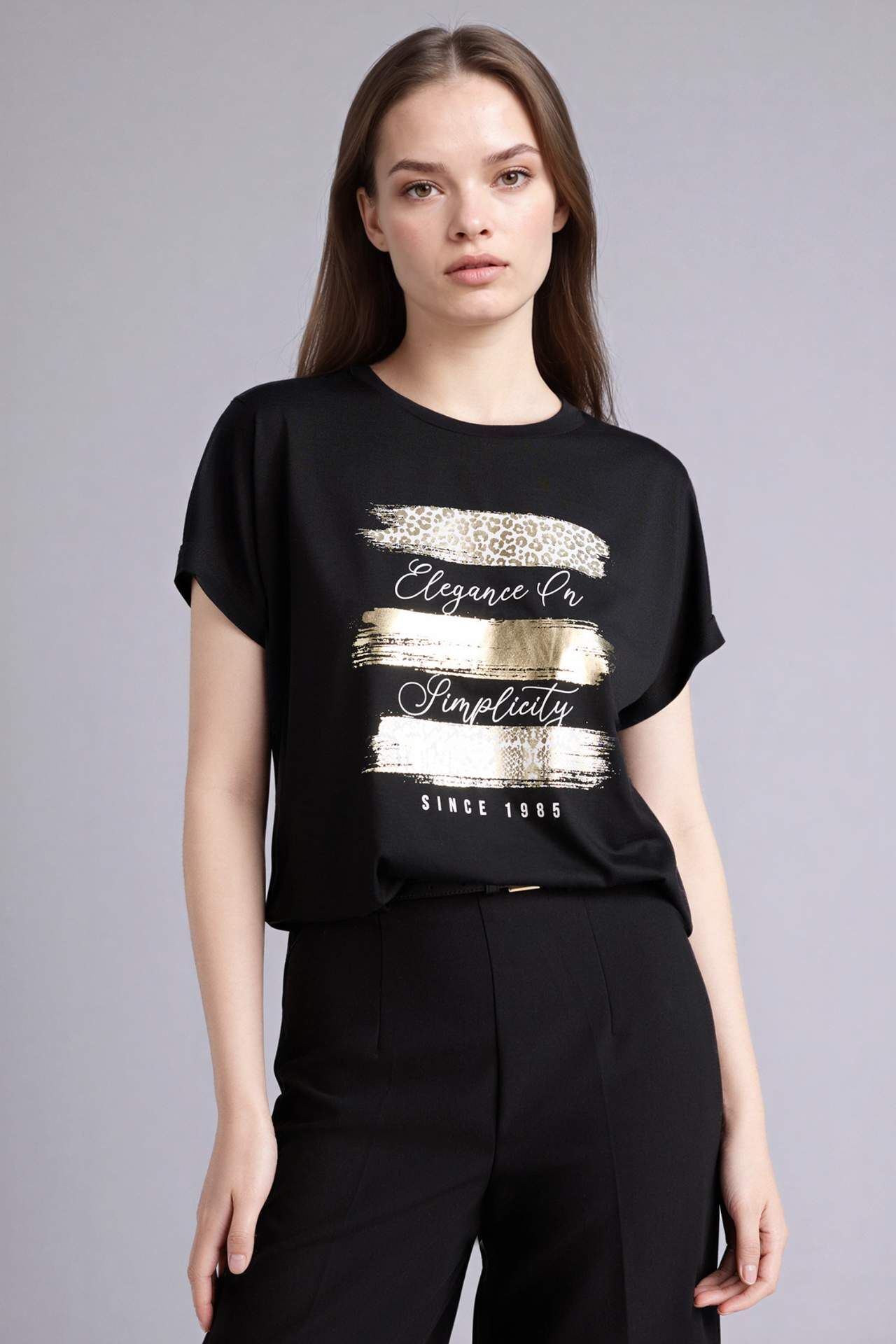 Yetişkin kadınlar için yaz aylarında tercih edilebilecek siyah renkli, hayvan baskılı kısa kollu tişört. Bisiklet yaka detayıyla şıklığına şıklık katan bu örme ürün, rahat bir şekilde kullanım sunar. Stil ve konforu bir arada arayanlar için ideal bir seçim. Viskoz 34%,Poliester 66% Manken Bedeni: Göğüs: 83 Boy: 1,81 Basen: 92 Bel: 62