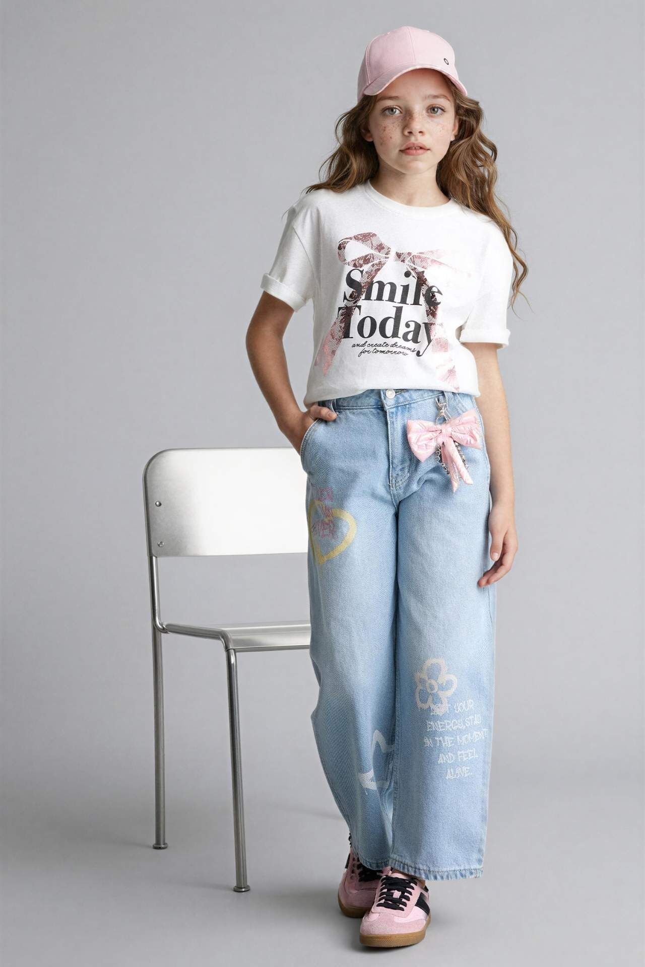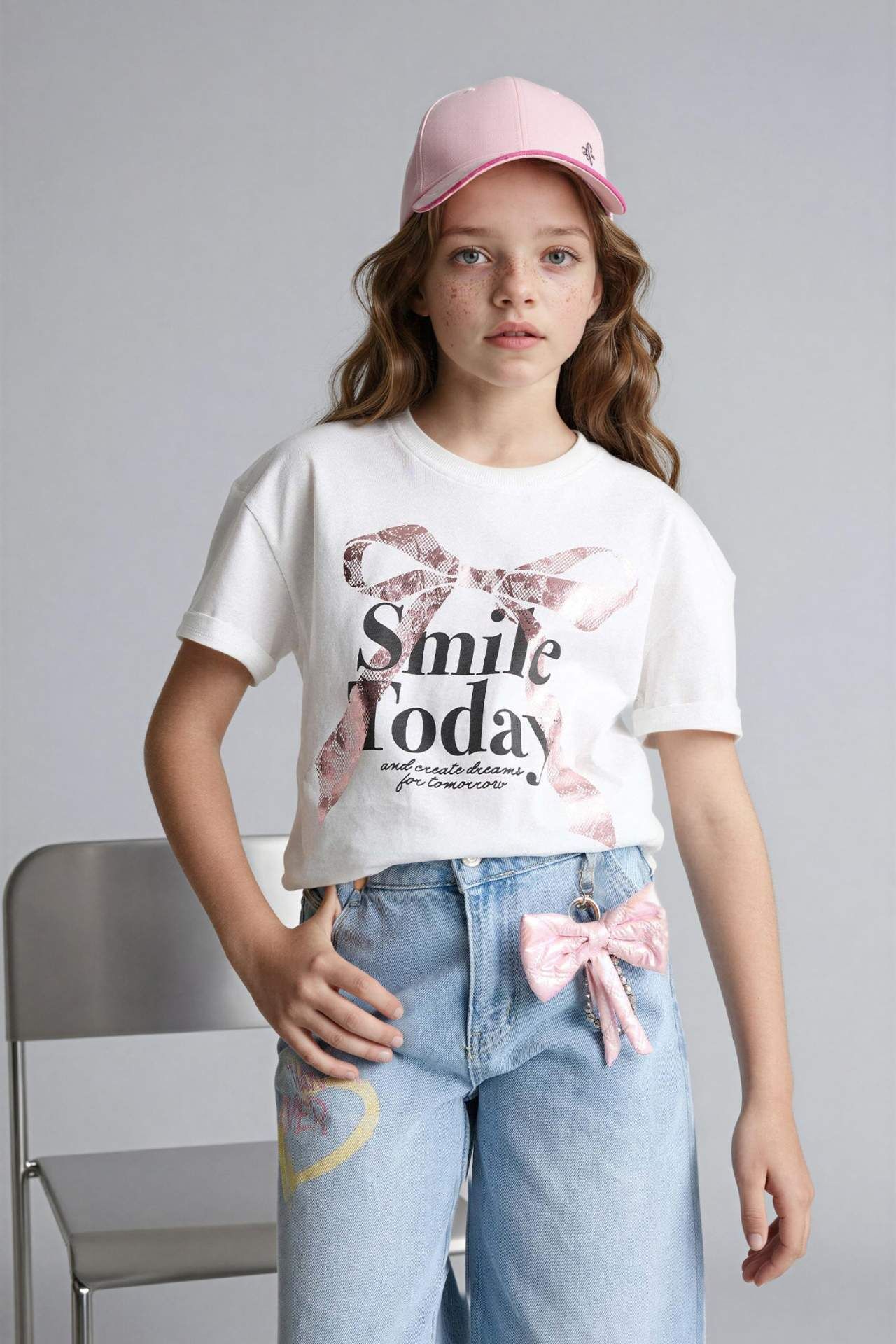 DeFacto Relax Fıt Bisiklet Yaka Slogan Baskılı Kısa Kollu Tişört Kız Çocuk