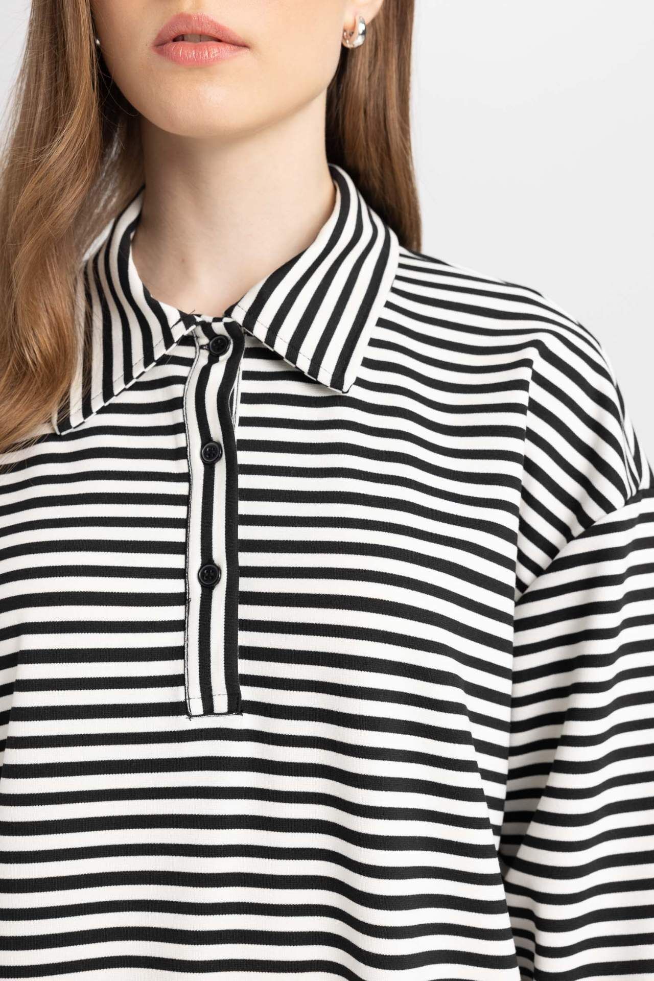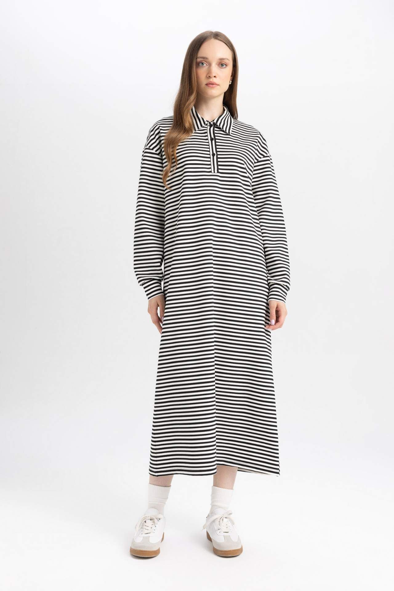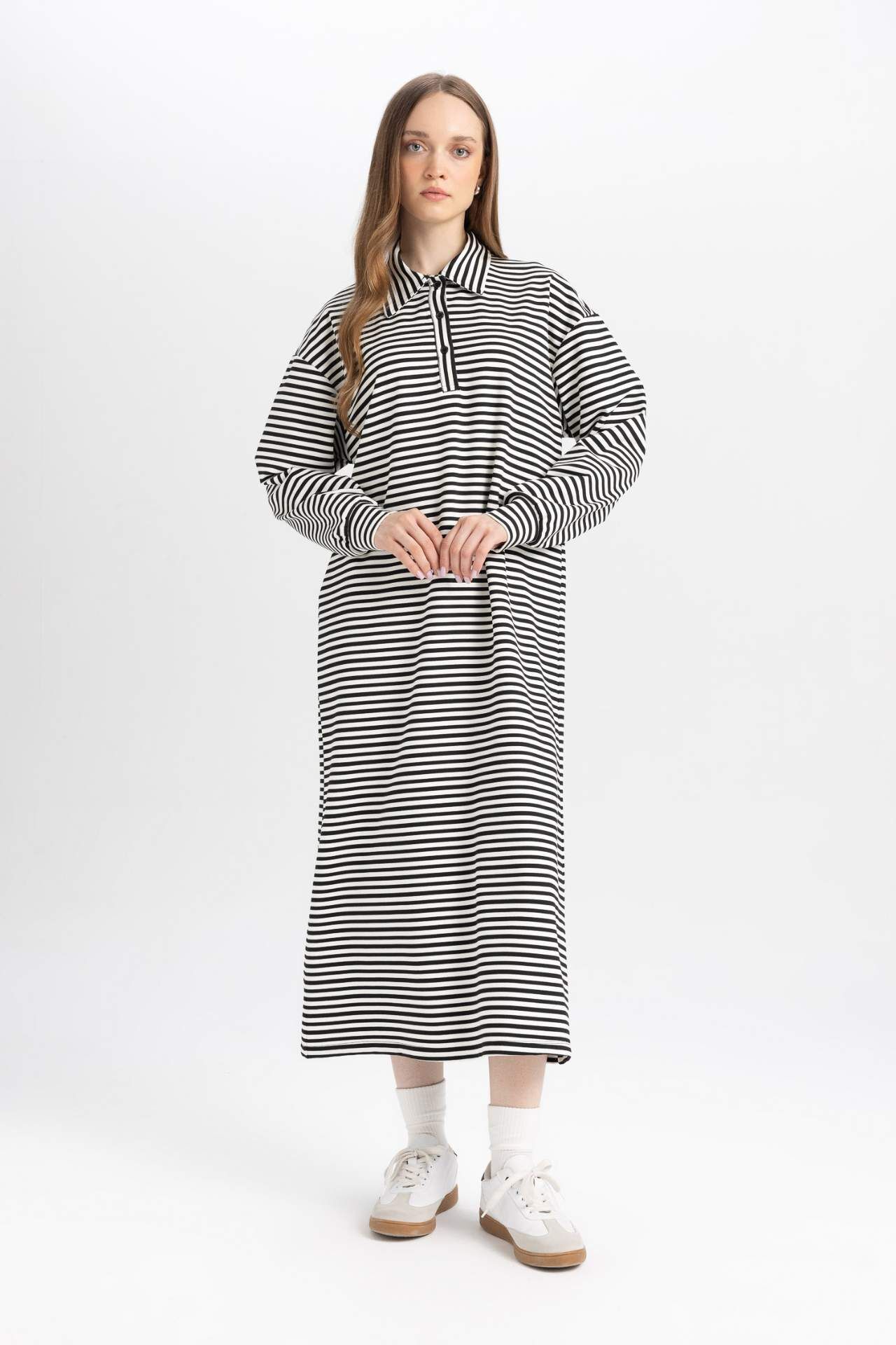Relax Fit Çizgili Polo Yaka Uzun Kollu Maxi Elbise