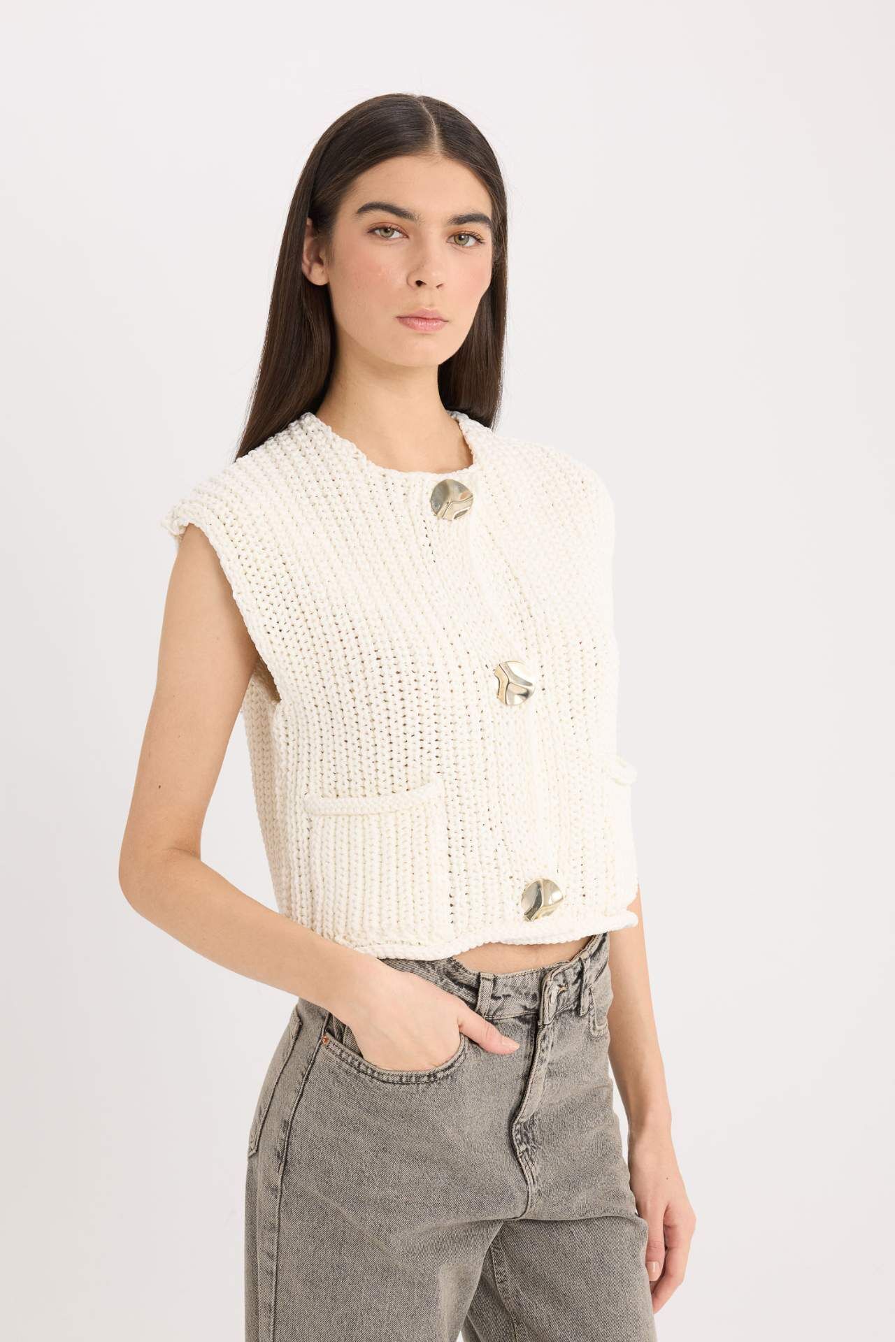 Relax Fit Düğme Kapamalı Cepli Triko Yelek
