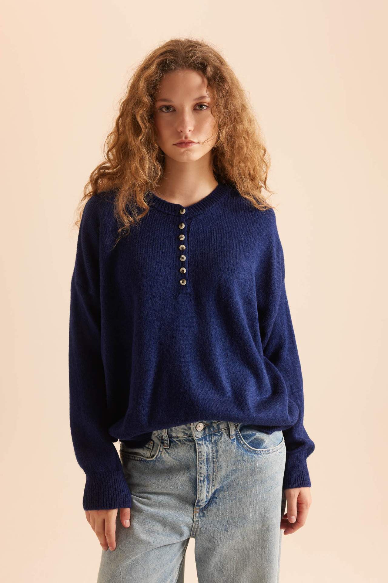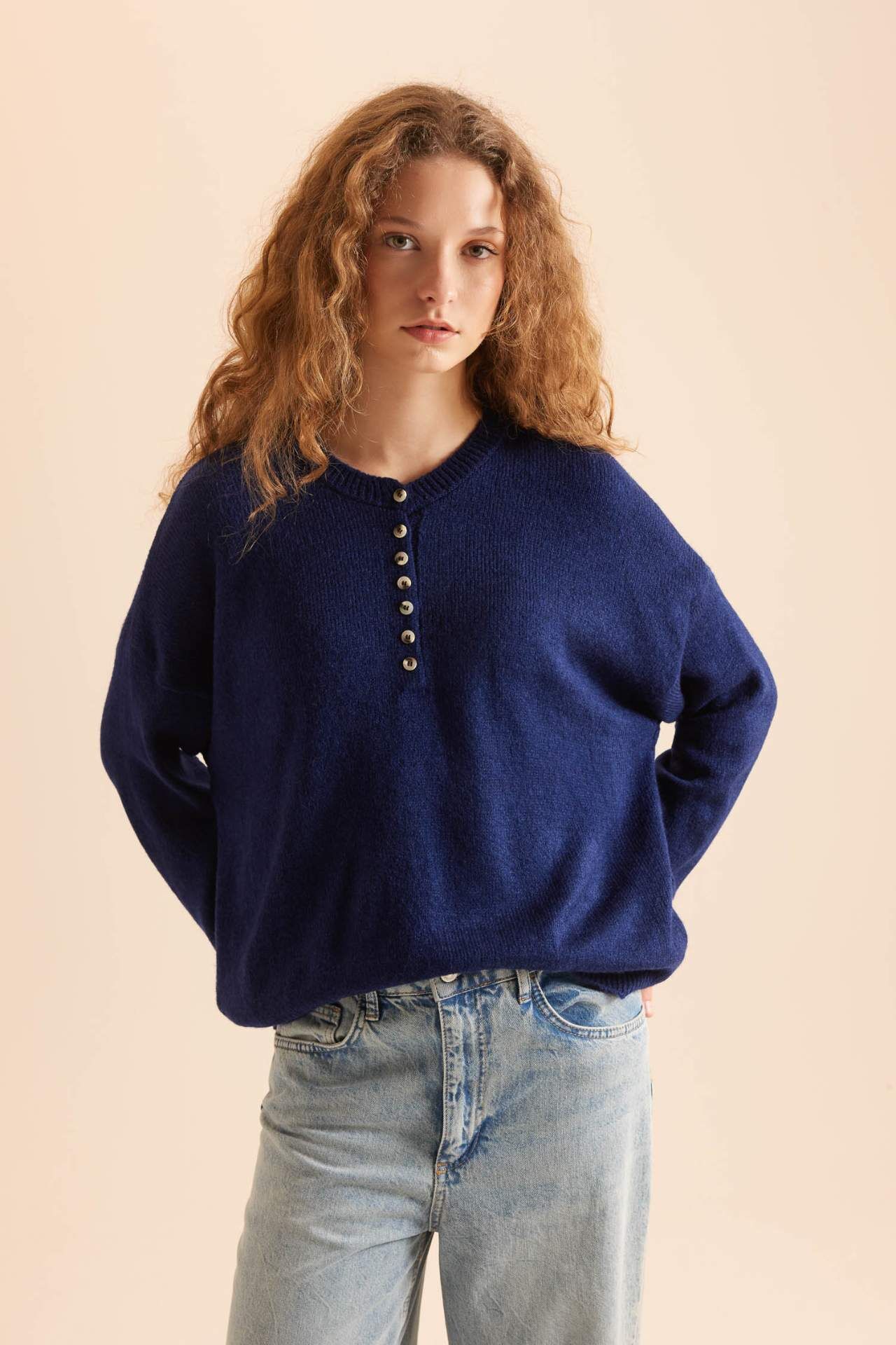 DeFacto Relax Fit Düğmeli Yaka Triko Kazak D4913AXNSNV131