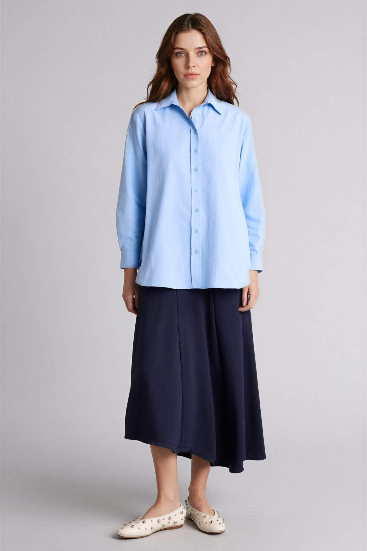 Yetişkinler için mavi pamuklu uzun kollu tunik. İnce poplin kumaştan üretilmiş, rahat bir şekilde giyilebilir. İlkbahar mevsimine uygun temel bir parça. Gömlek yaka detayıyla şıklığı tamamlar. Boyu 78 cm'dir. Kadınlar için ideal bir seçim. Pamuk 58%,Poliester 42% Manken Bedeni: Göğüs: 88 Boy: 1,72 Basen: 90 Bel: 60