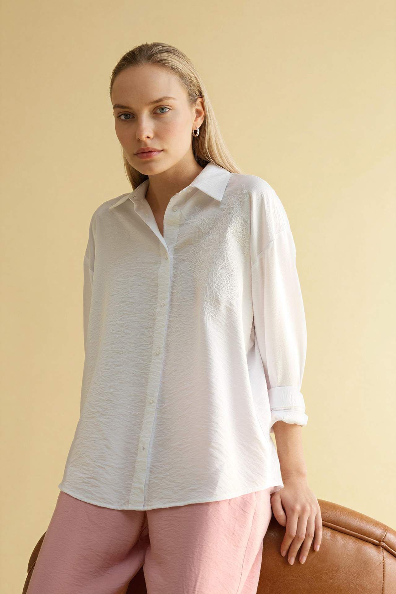Yetişkin kadınlar için ideal olan bu uzun kollu gömlek, şık ve rahat bir stili bir arada sunar. Dantel detaylarıyla göz alıcı bir görünüm sağlar. Beyaz renkte ve relax fit kalıbıyla her bedene uyum sağlar. İlkbahar/Yaz koleksiyonunun temel parçalarından biridir. Gömlek yakası detayıyla zarif bir hava katıyor. Poliamid 11%,Viskoz 89% Manken Bedeni: Göğüs: 84 Boy: 1,72 Basen: 92 Bel: 61