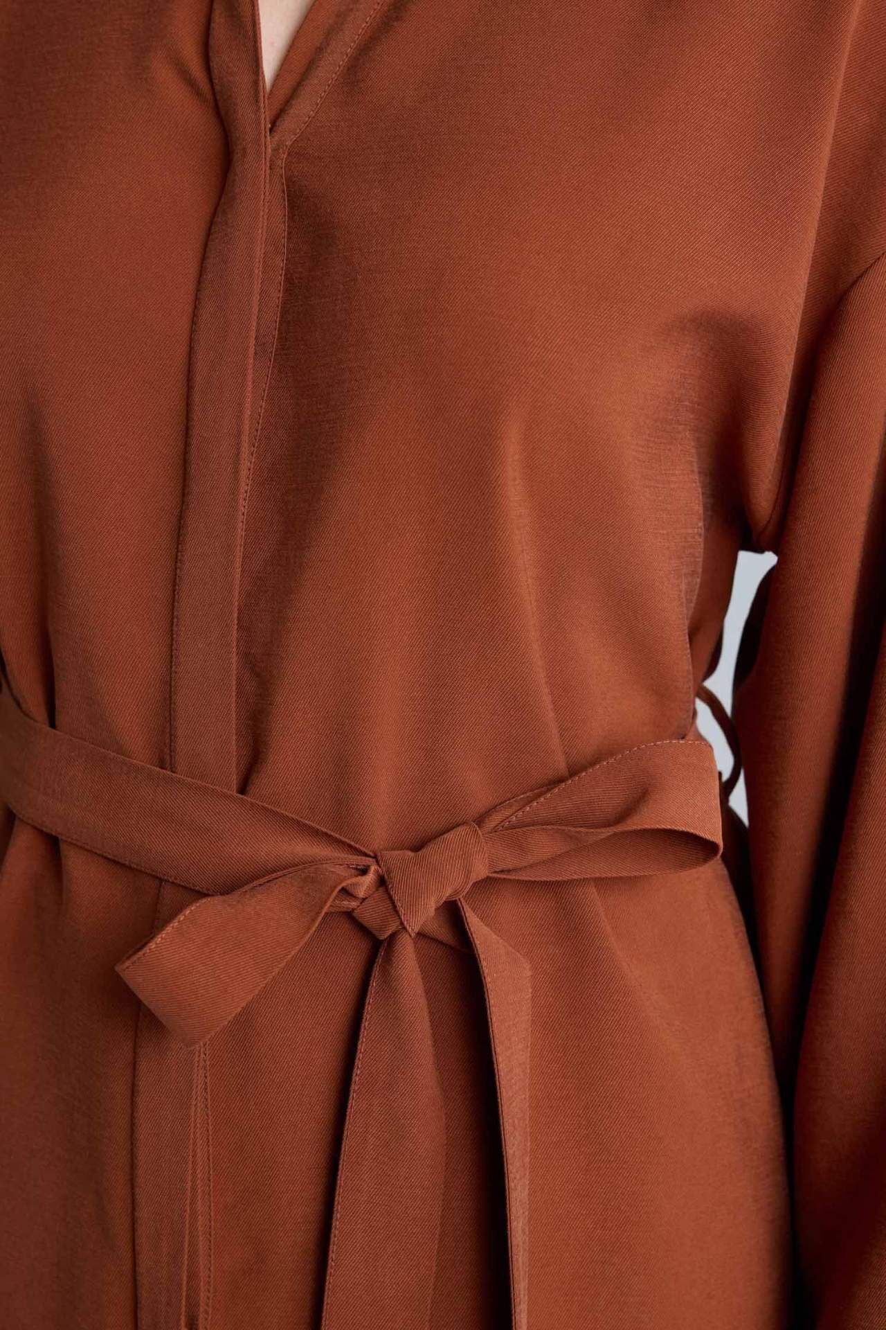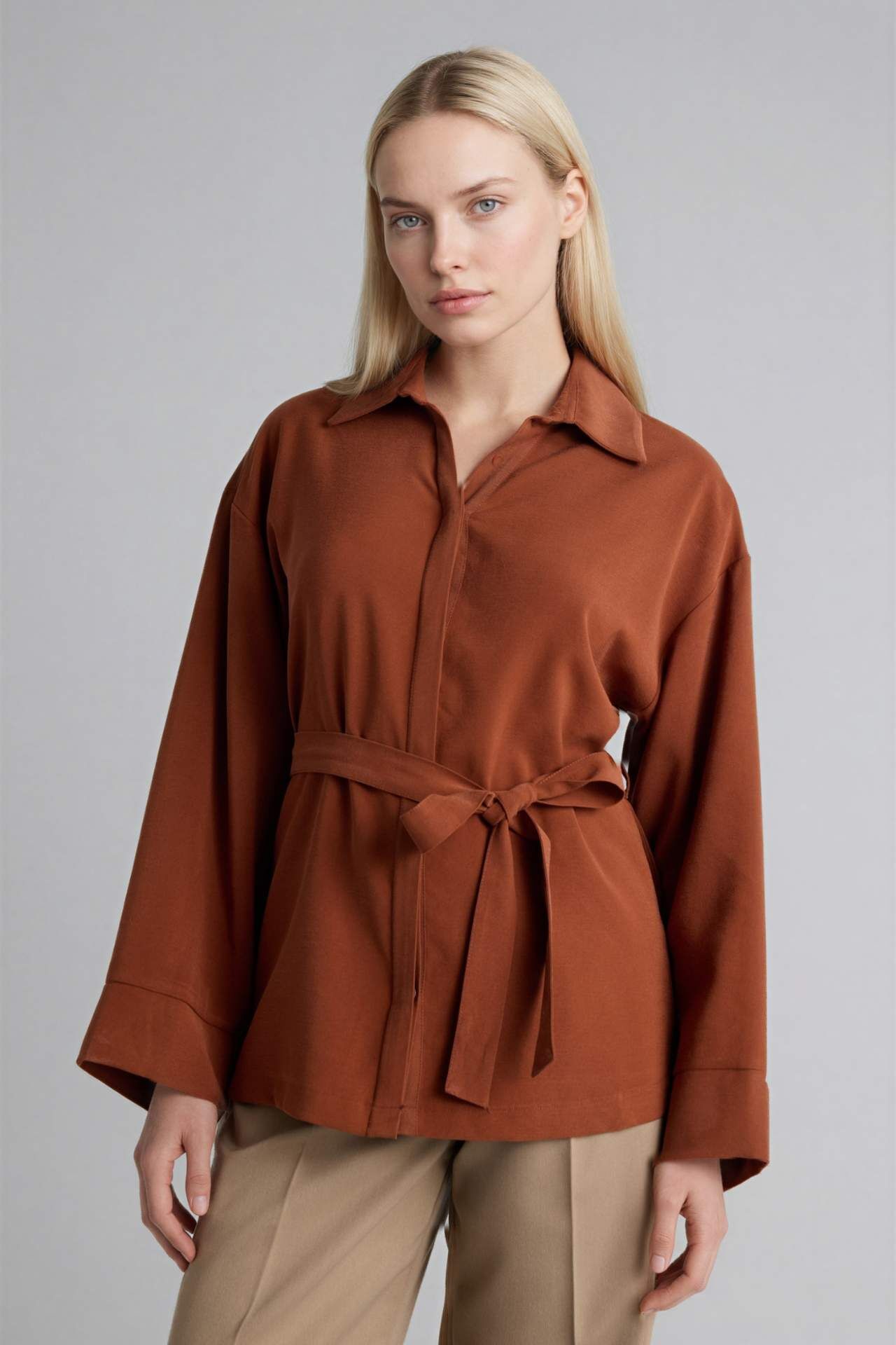 Profesyonel ve güvenilir bir tarzda, uzun kollu kahverengi dokuma üst, yetişkin kadınlar için uygun. Sürdürülebilir malzemeler kullanılarak üretilmiştir. Rahat bir şekilde giyilebilen relax fit kesime sahiptir. İlkbahar/Yaz mevsimine uygun olan bu temel parça, gömlek yaka detayıyla şıklığı tamamlar. Viskoz 92%,Poliester 8% Manken Bedeni: Göğüs: 84 Boy: 1,72 Basen: 92 Bel: 61