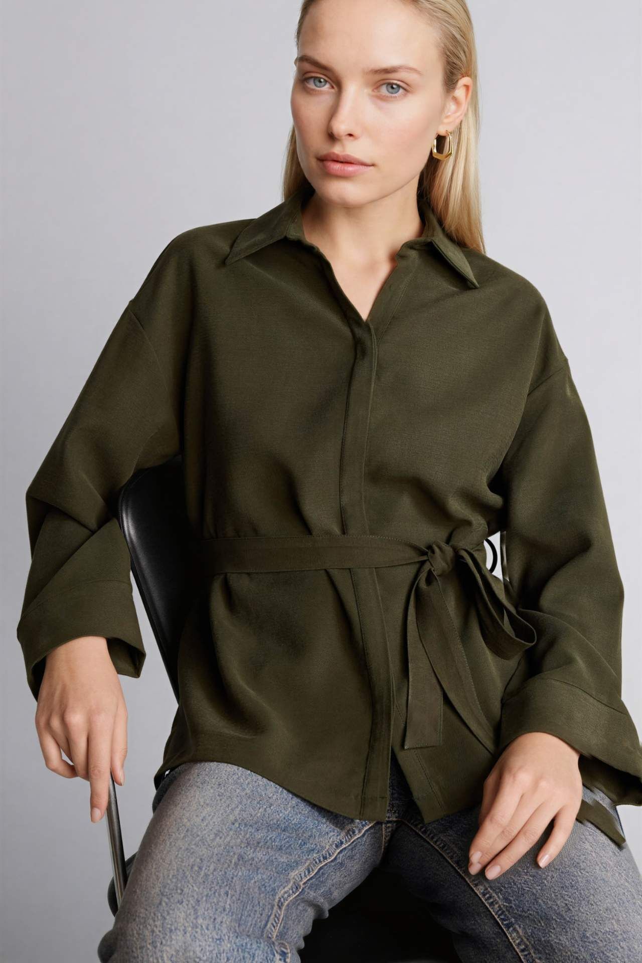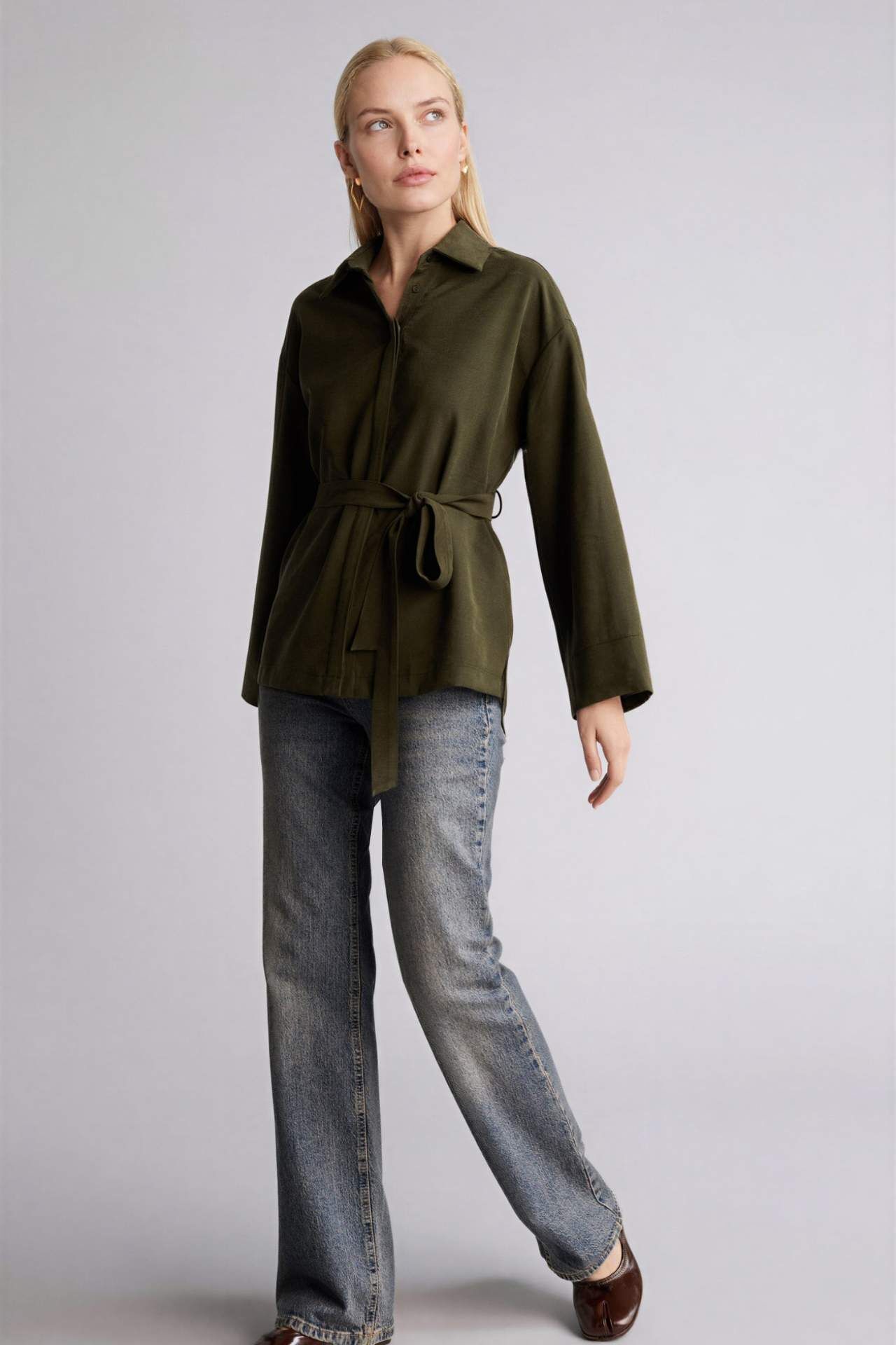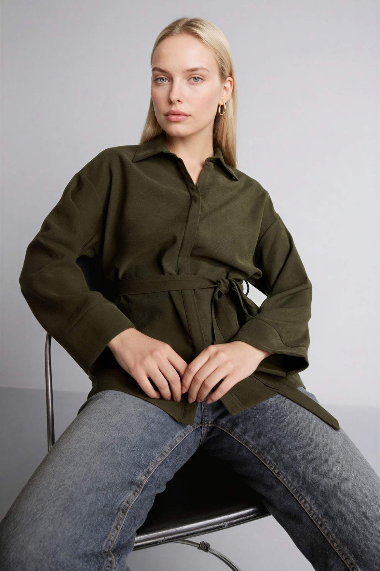 Yetişkin kadınlar için tasarlanmış sürdürülebilir Haki renkli uzun kollu gömlek. Rahat kesimli ve gömlek yaka detayıyla öne çıkıyor. İlkbahar/Yaz sezonunda gardırobunuza şıklık katacak temel bir parça. Viskoz 92%,Poliester 8% Manken Bedeni: Göğüs: 84 Boy: 1,72 Basen: 92 Bel: 61