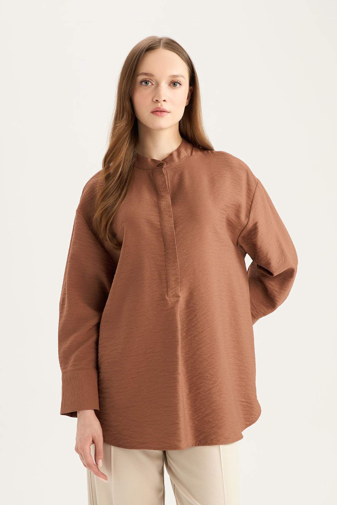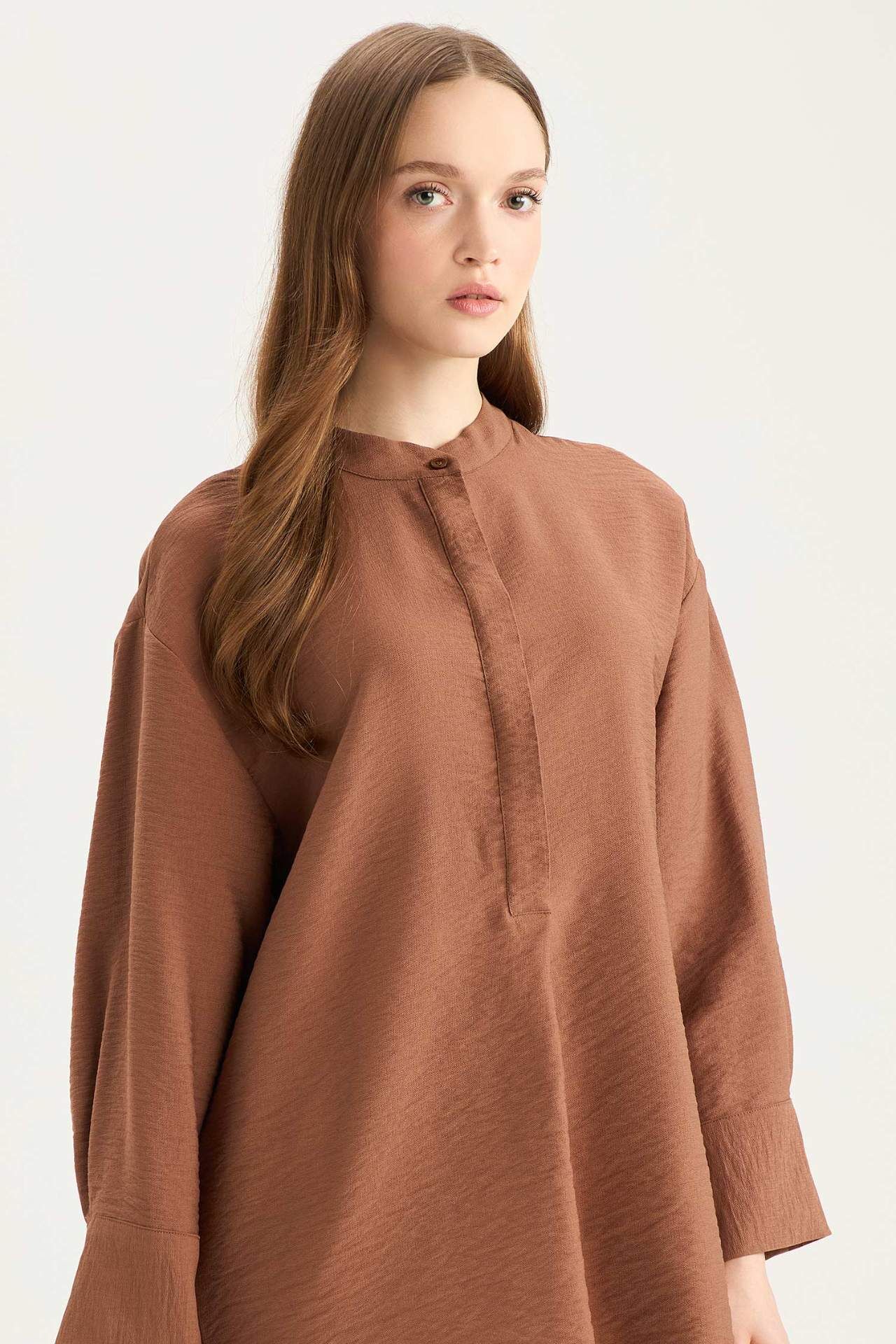 Relax Fit Hakim Yaka Basic Düz Uzun Kollu Gömlek Tunik E1757AX25SPBN519