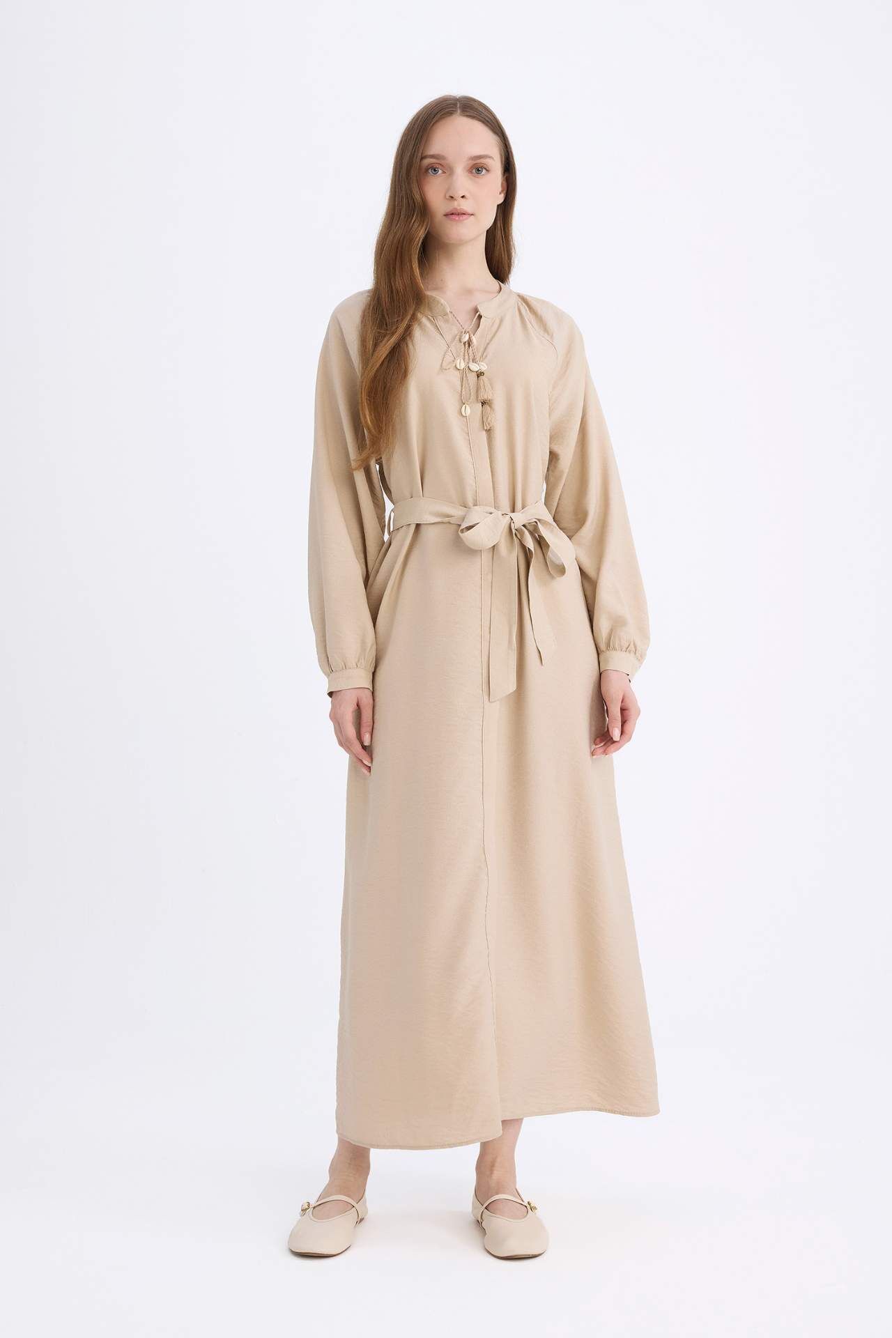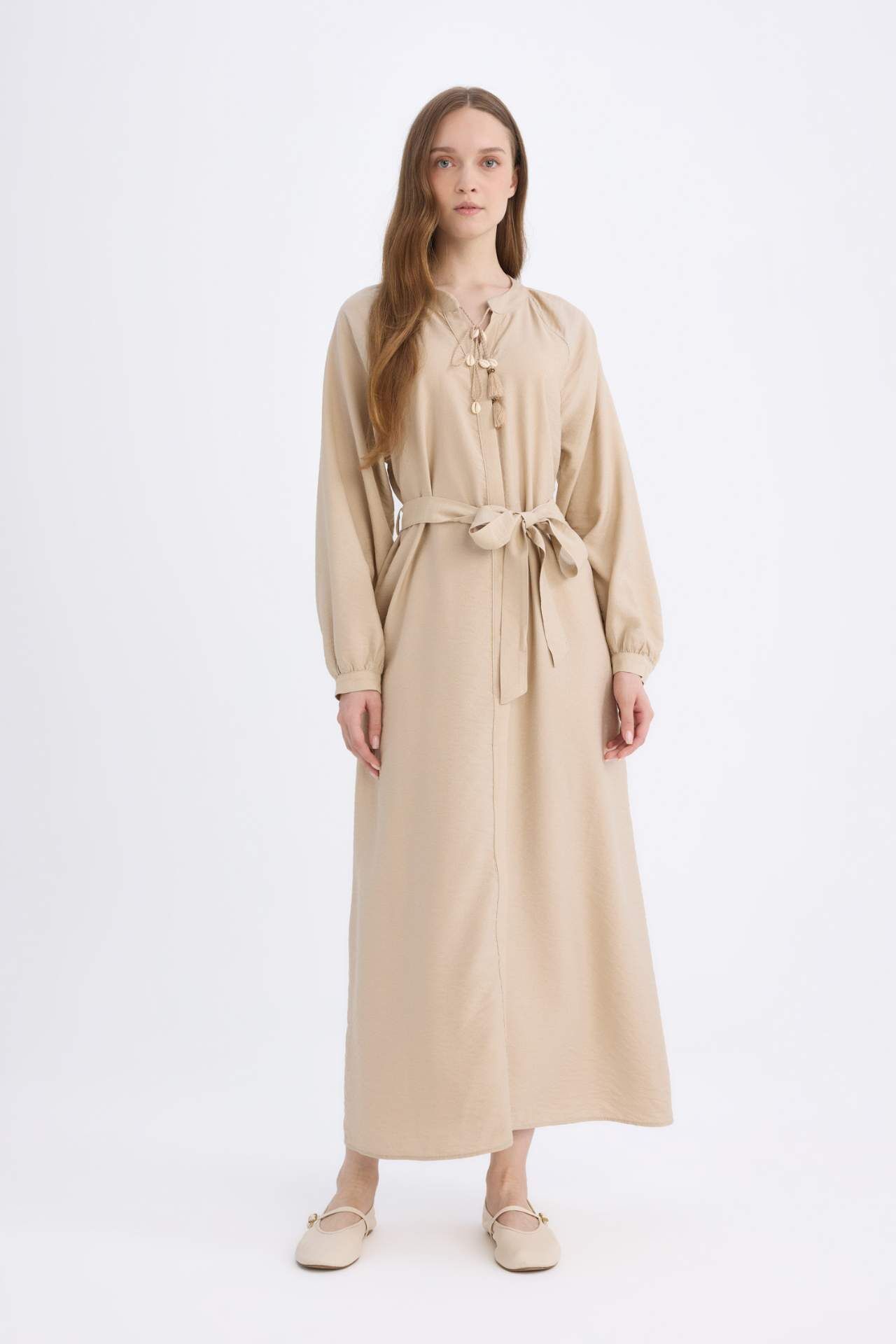 Relax Fit Hakim Yaka Uzun Kollu Kuşaklı Maxi Elbise