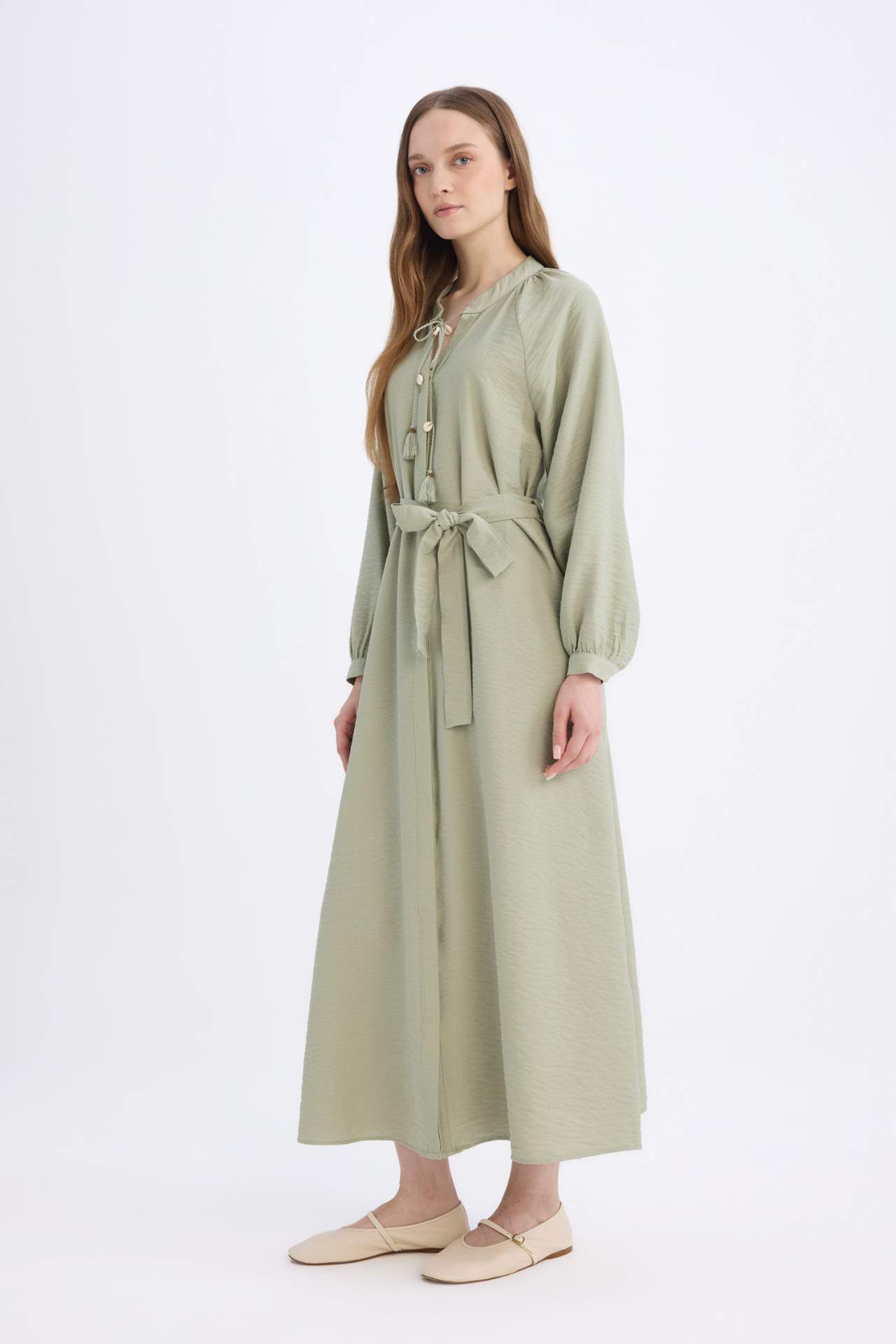 Relax Fit Hakim Yaka Uzun Kollu Kuşaklı Maxi Elbise