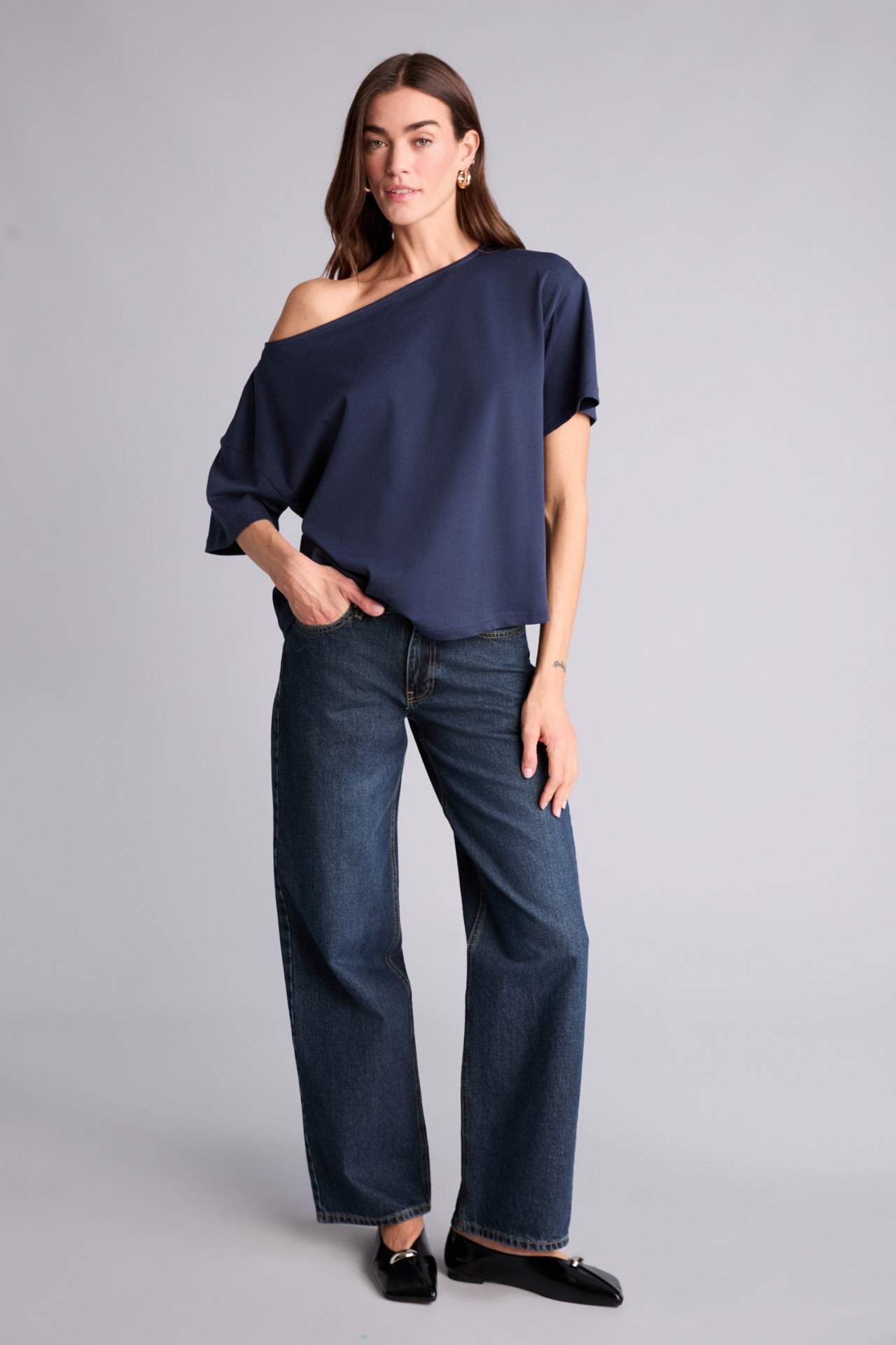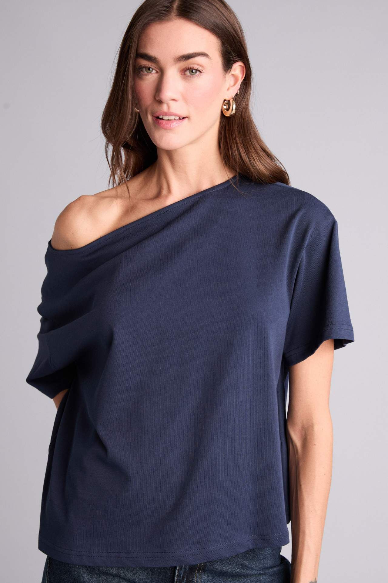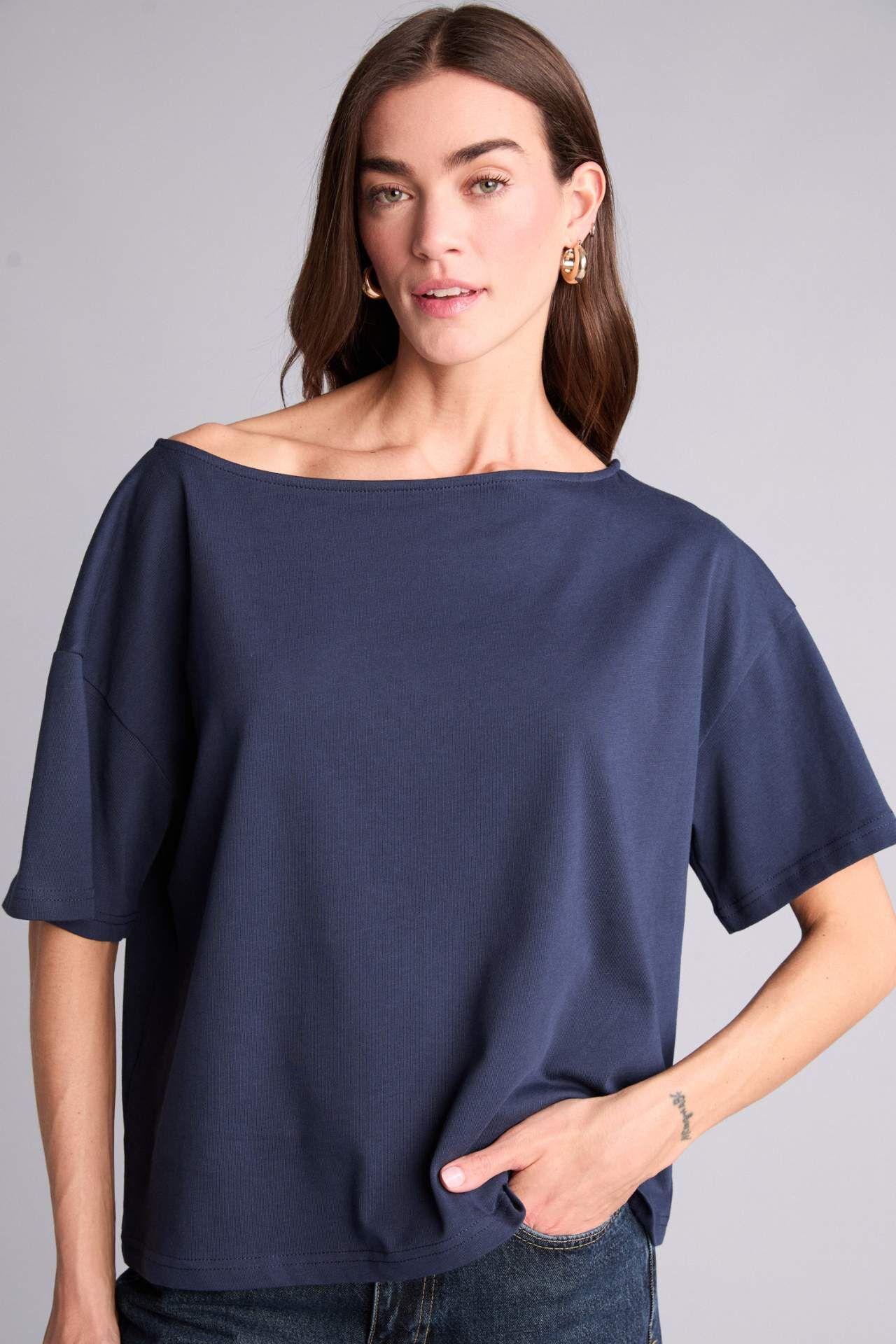 Yetişkin kadınlar için örme kumaştan üretilmiş lacivert kısa kollu tişört. Basit ve şık deseni ile rahat bir giyim deneyimi sunar. İlkbahar ve yaz mevsimlerinde tercih edebileceğiniz kayık yaka modeli, relax fit kalıbıyla vücudu kusursuzca sarar. Ana çeşit içerisindeki bu ürün, gardırobunuzun vazgeçilmezi olacak. Pamuk 100% Manken Bedeni: Göğüs: 89 Boy: 1,78 Basen: 92 Bel: 63