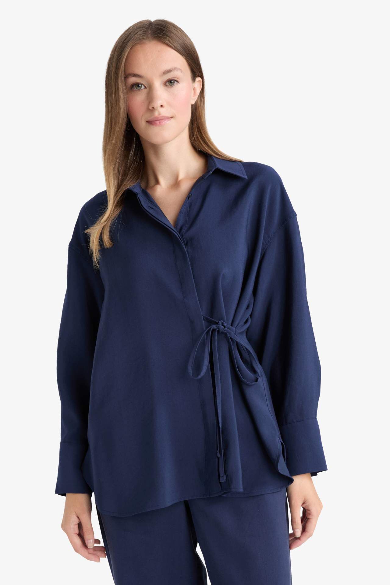 Relax Fit Modal Önden Bağlamalı Uzun Kollu Gömlek Tunik