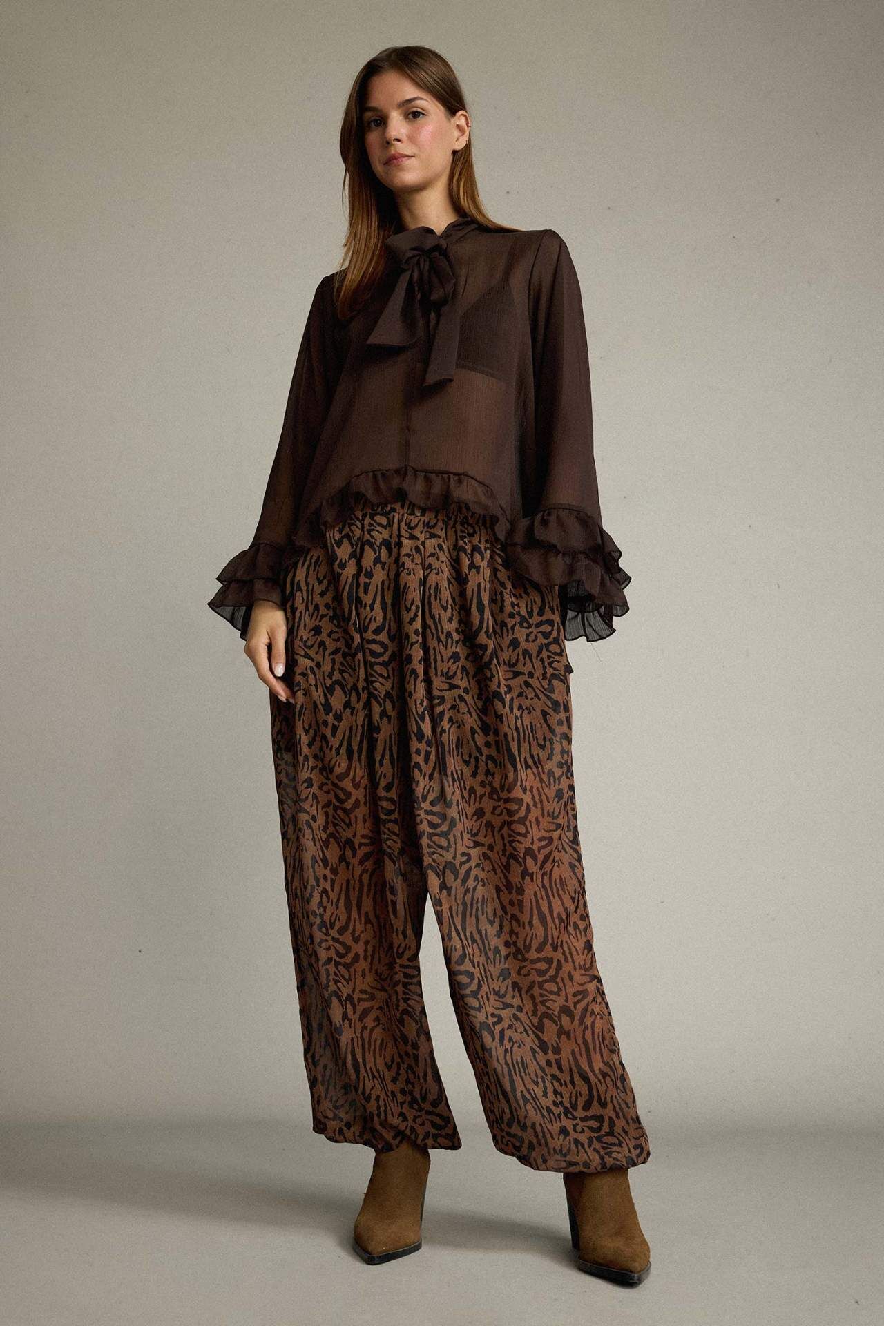 Rahat kesimi ve şık leopar deseniyle öne çıkan Relax Fit Normal Bel Şifon Pantolon, gün boyu konfor sağlar. Hafif ve akışkan kumaşı sayesinde hem günlük hem özel kombinlerde şıklık sunar. Poliester 100%,Poliester 100%,Poliester 100%,Poliester 100%,Poliester 100%,Poliester 100%,Poliester 100%