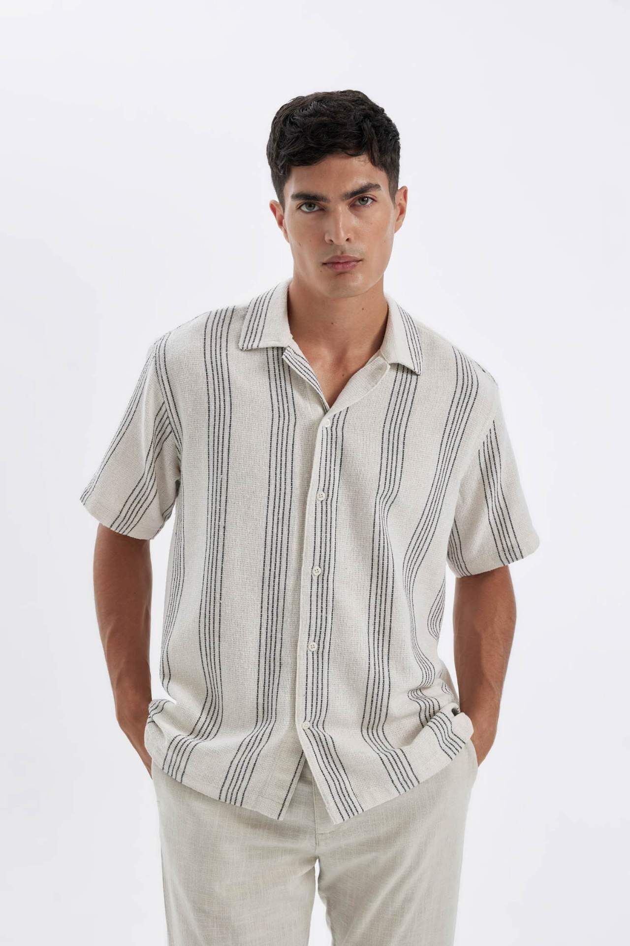 DeFactoFit Relax Fit Polo Yaka Çizgili Kısa Kollu Gömlek