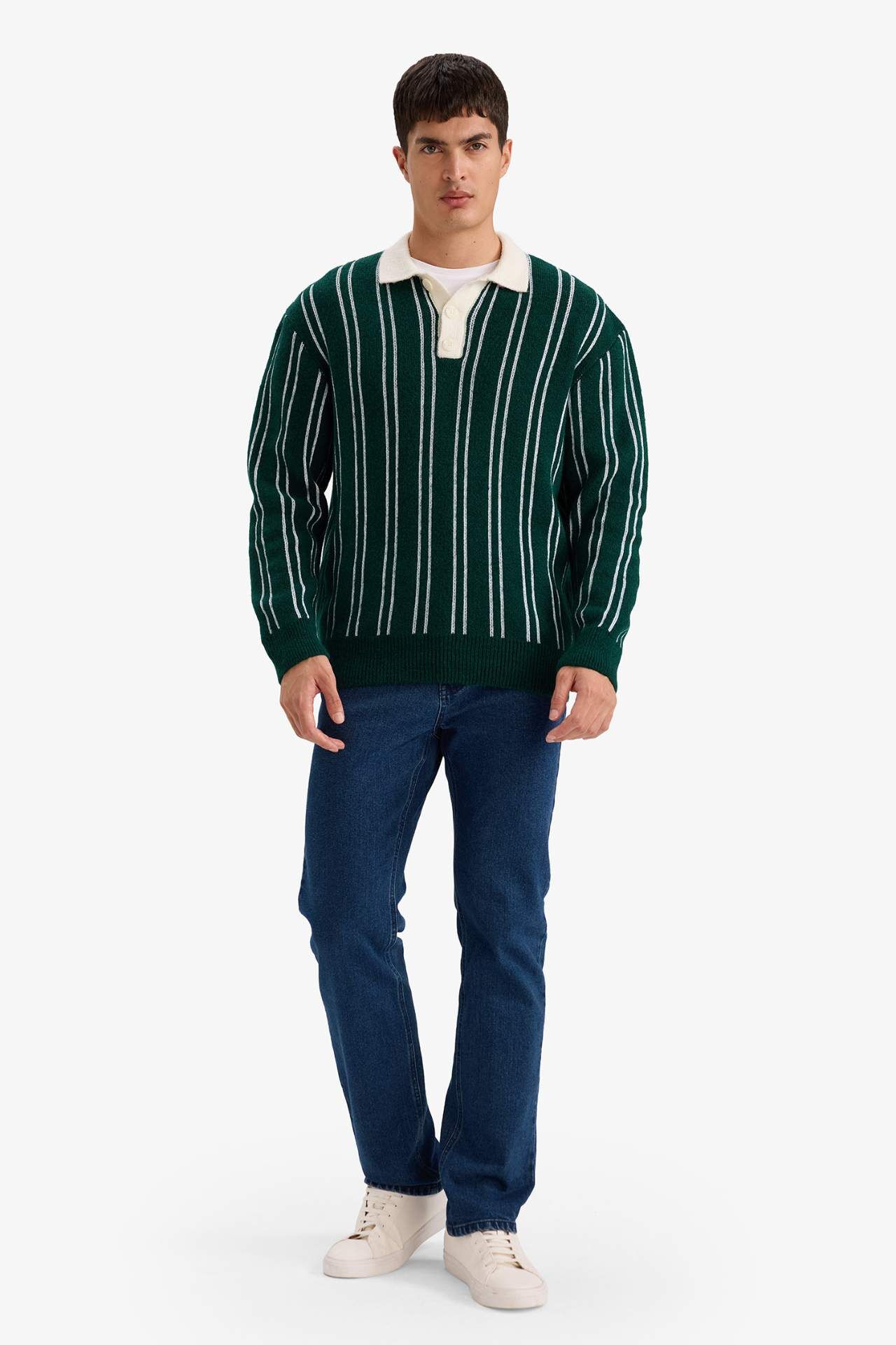 Relax Fit Polo Yaka Çizgili Triko Kazak