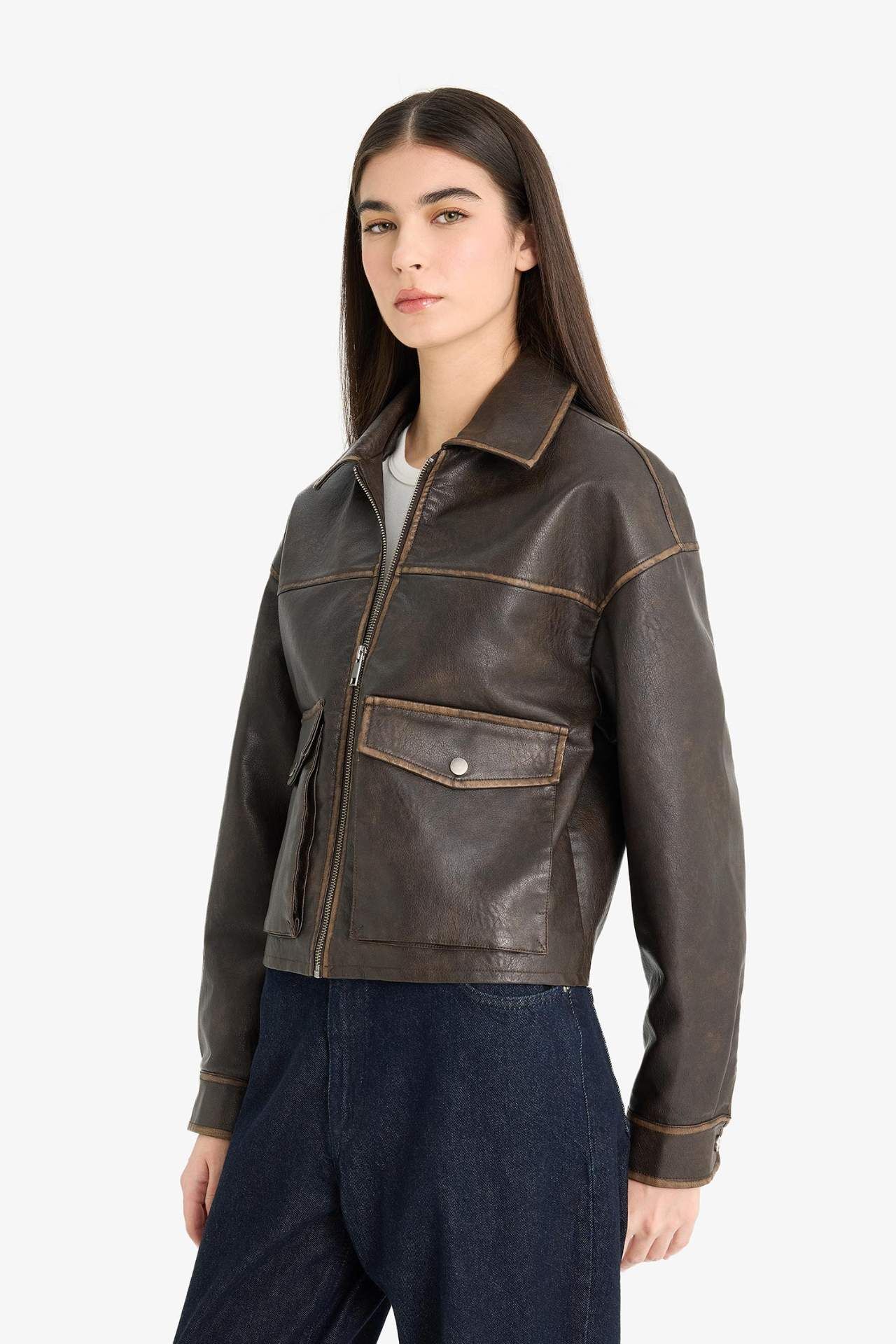 Relax Fit Polo Yaka Tafta Suni Deri Mont