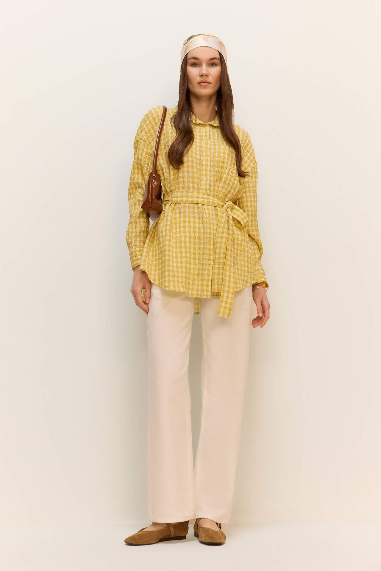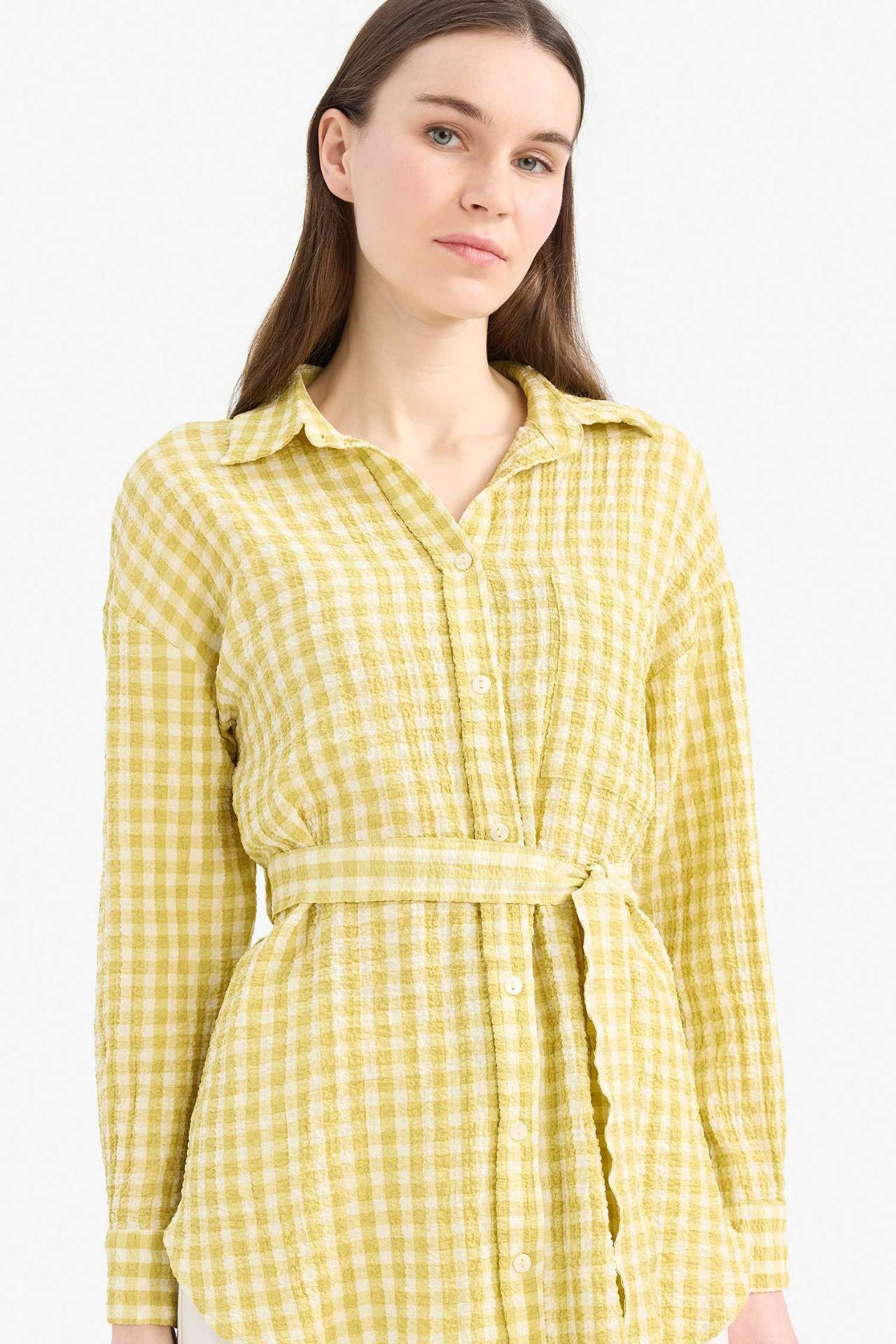Relax Fit Pötikareli Gofre Dokulu Kuşaklı Uzun Kollu Gömlek Tunik