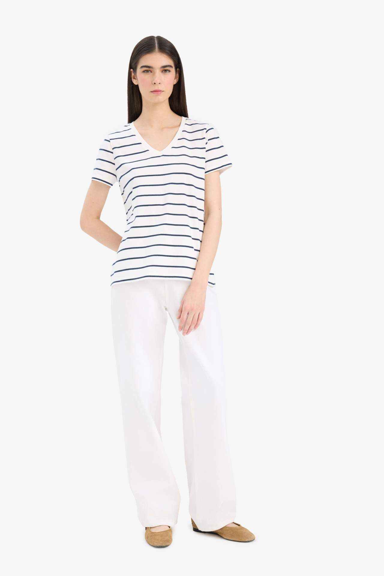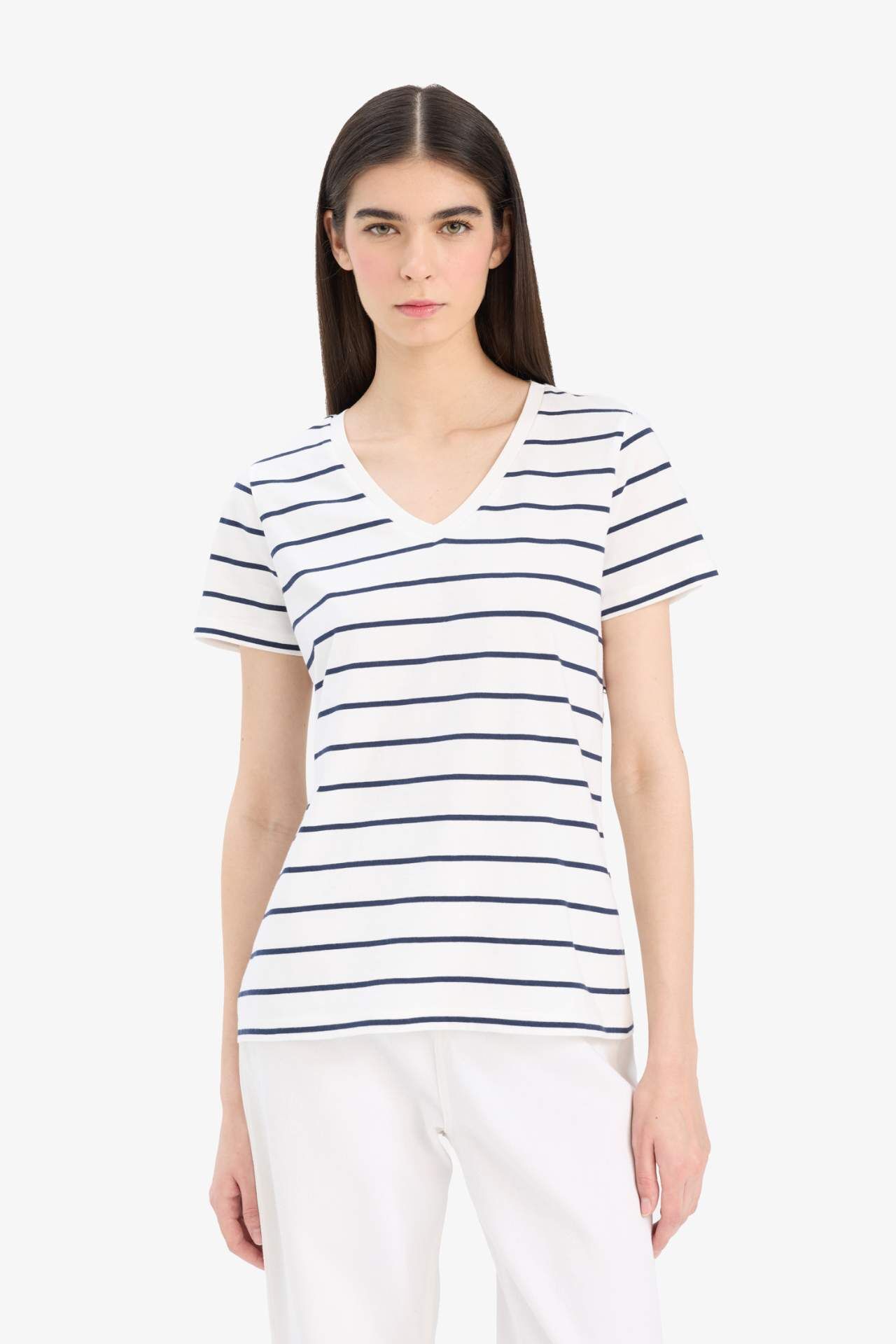 DeFacto Relax Fit V Yaka Çizgili Kısa Kollu Tişört