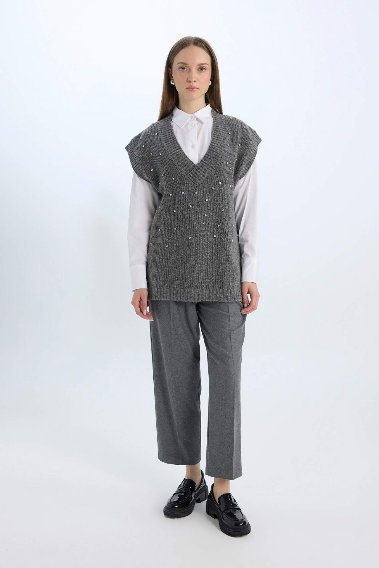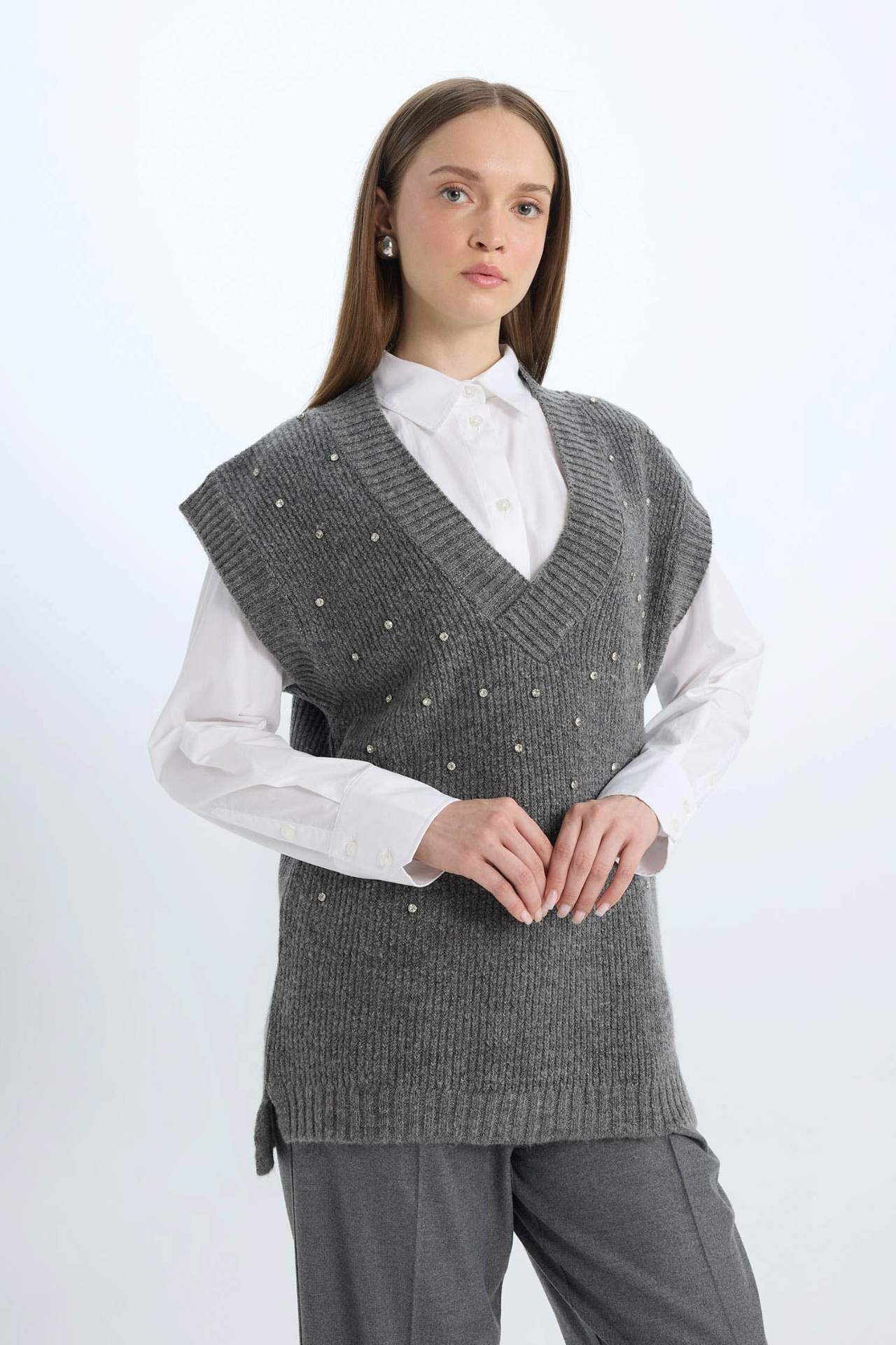 DeFacto Relax Fit V Yaka Taşlı Süveter
