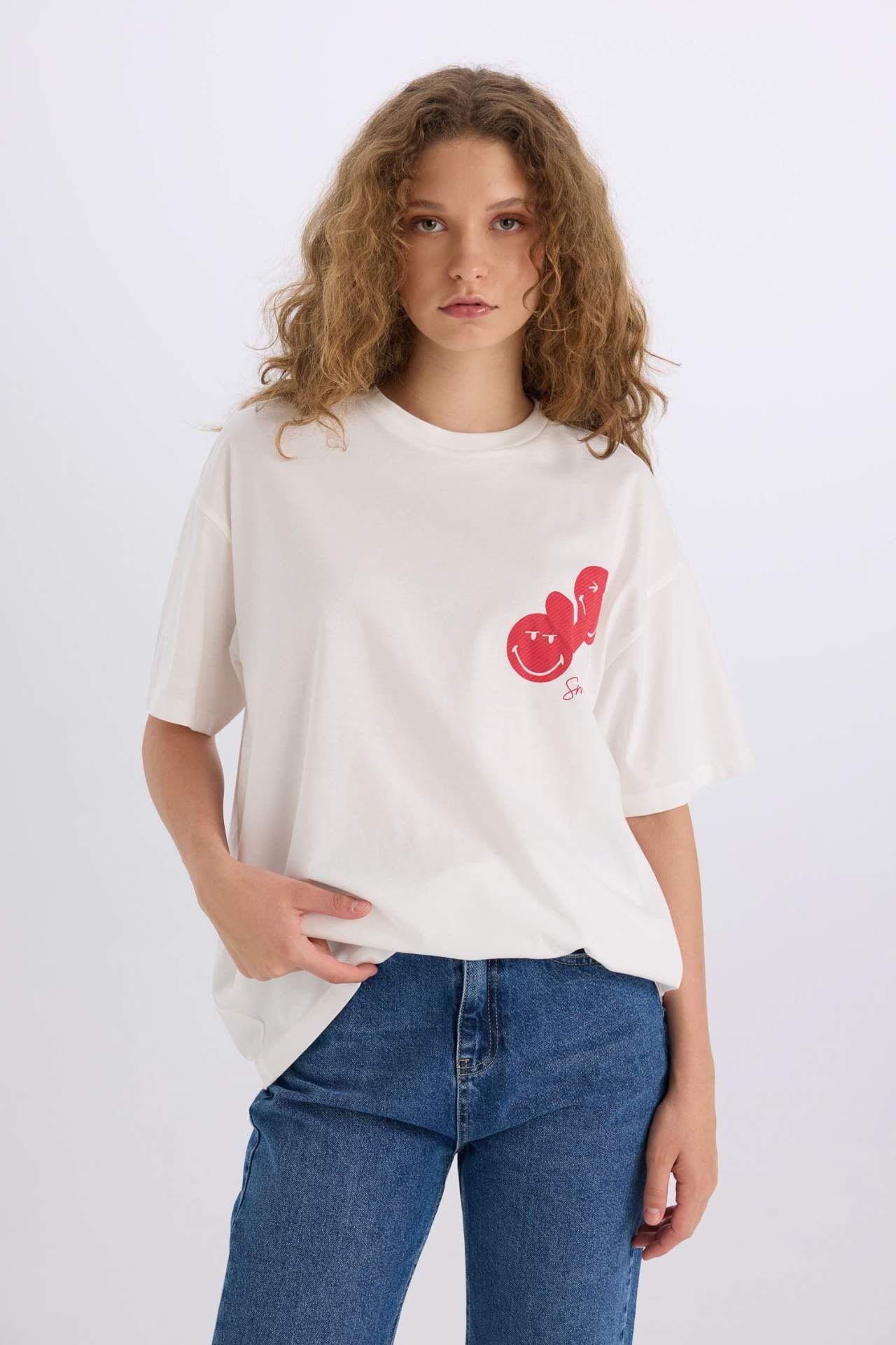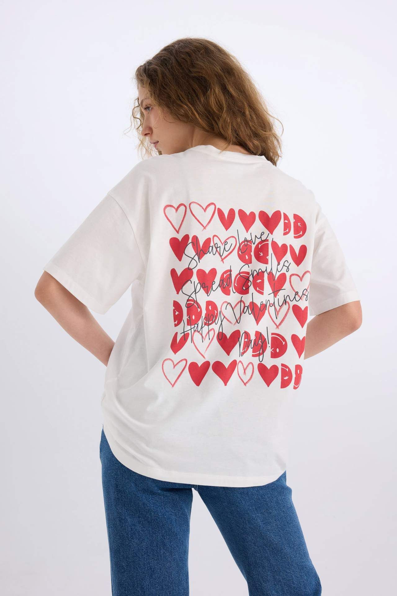 Sevgililer Günü SmileyWorld Oversize Geniş Kalıp Bisiklet Yaka Sırt Baskılı Kısa Kollu Tişört