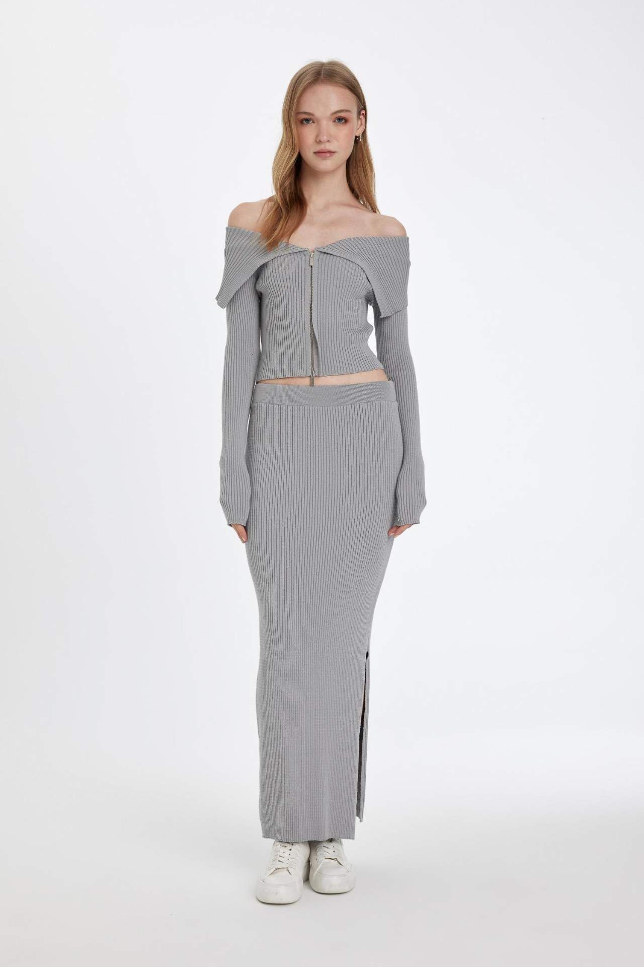 DeFacto Slim Fit Açık Omuz Fermuarlı Hırka